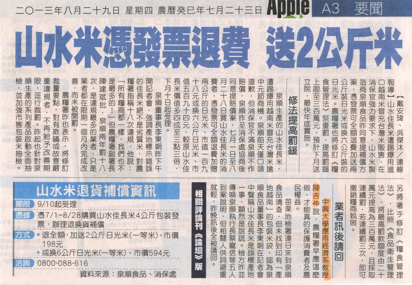 泉順生產的山水佳長米,遭踢爆用越南米冒充台灣米搶中元節商機。泉順前天僅口頭道歉,但消保官不滿泉順不作賠償,泉順昨至消保處協商後同意提賠償案,七月一日至八月二十八日買山水佳長米的消費者,憑發票可全額退費加贈兩公斤的日光米、市值一百九十八元或換六公斤日光米、市值五百九十四元,較原山水佳長米價值多四成至三點三倍,下月十日起受理。