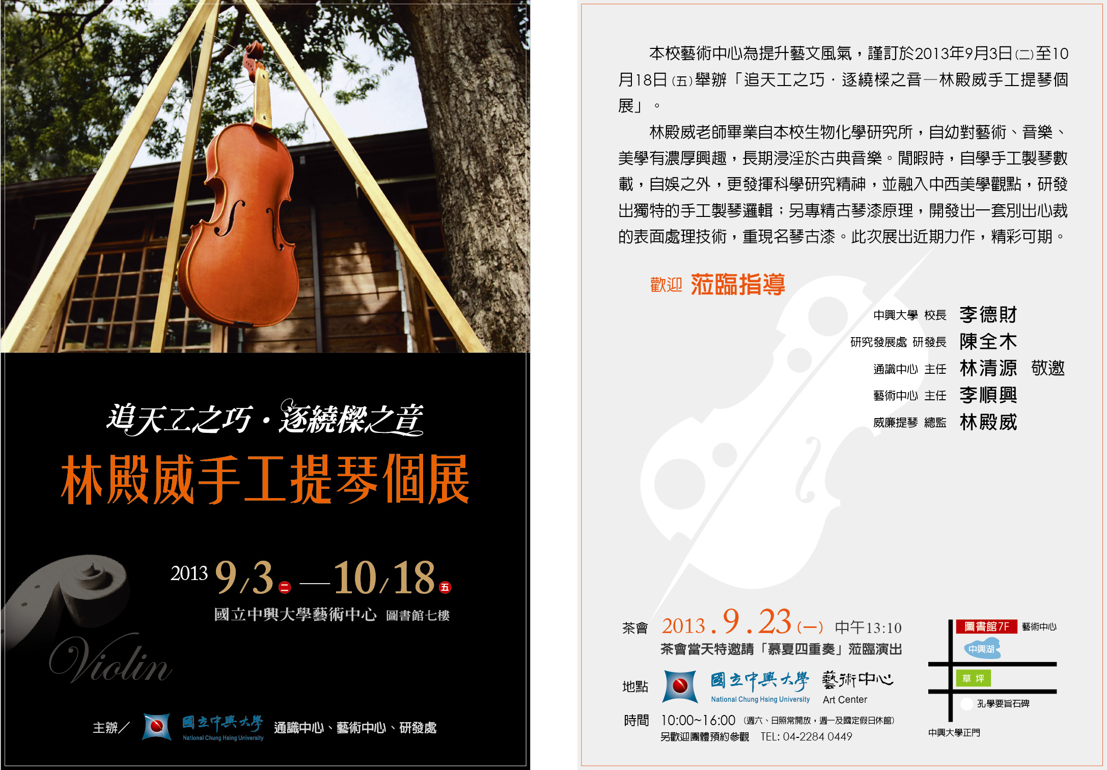 本校為提升藝術文化風氣,特舉辦「追天工之巧,逐繞樑之音-林殿威手工提琴個展」。林殿威老師畢業自本校分子生物研究所,自幼對藝術、音樂、美學有濃厚興趣,長期浸淫於古典音樂之中。閒暇時,自學手工製琴數載有成,自娛之外,更發揮科學研究精神,並融入中西美學觀點,研發出獨特的手工製琴邏輯;另專精古琴漆原理,開發出一套別出心裁的表面處理技術,重現名琴古漆。此次展出近期力作,精彩可期。