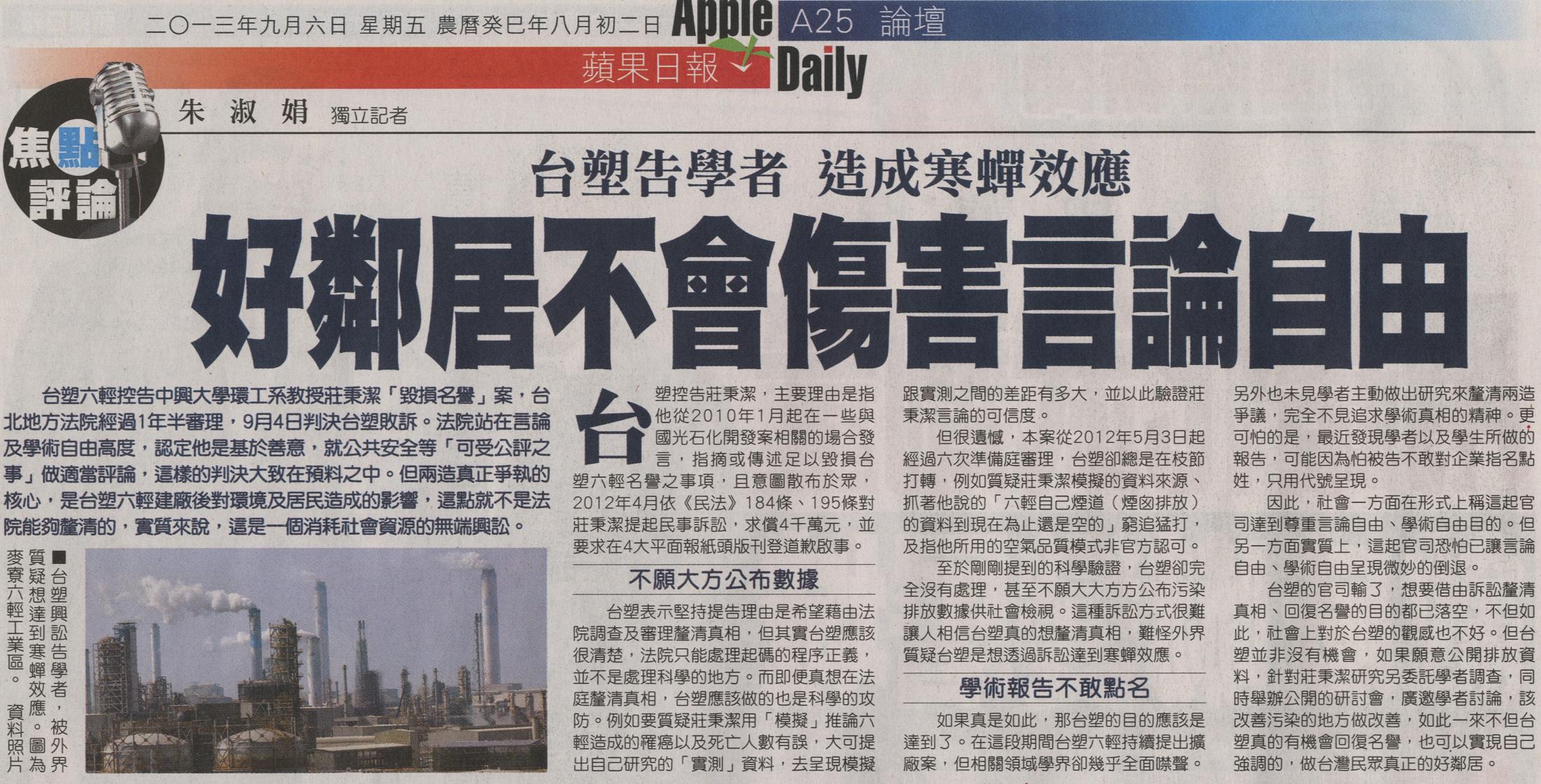 台塑六輕控告中興大學環工系教授莊秉潔「毀損名譽」案,台北地方法院經過1年半審理,9月4日判決台塑敗訴。法院站在言論及學術自由高度,認定他是基於善意,就公共安全等「可受公評之事」做適當評論,這樣的判決大致在預料之中。但兩造真正爭執的核心,是台塑六輕建廠後對環境及居民造成的影響,這點就不是法院能夠釐清的,實質來說,這是一個消耗社會資源的無端興訟。