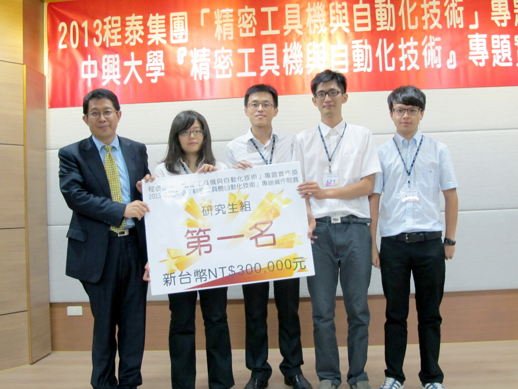台大生機所團隊榮獲興大與程泰集團舉辦的「精密工具機與自動化技術」專題競賽研究生組第一名,由教育部蔣偉寧部長(左1 )頒獎