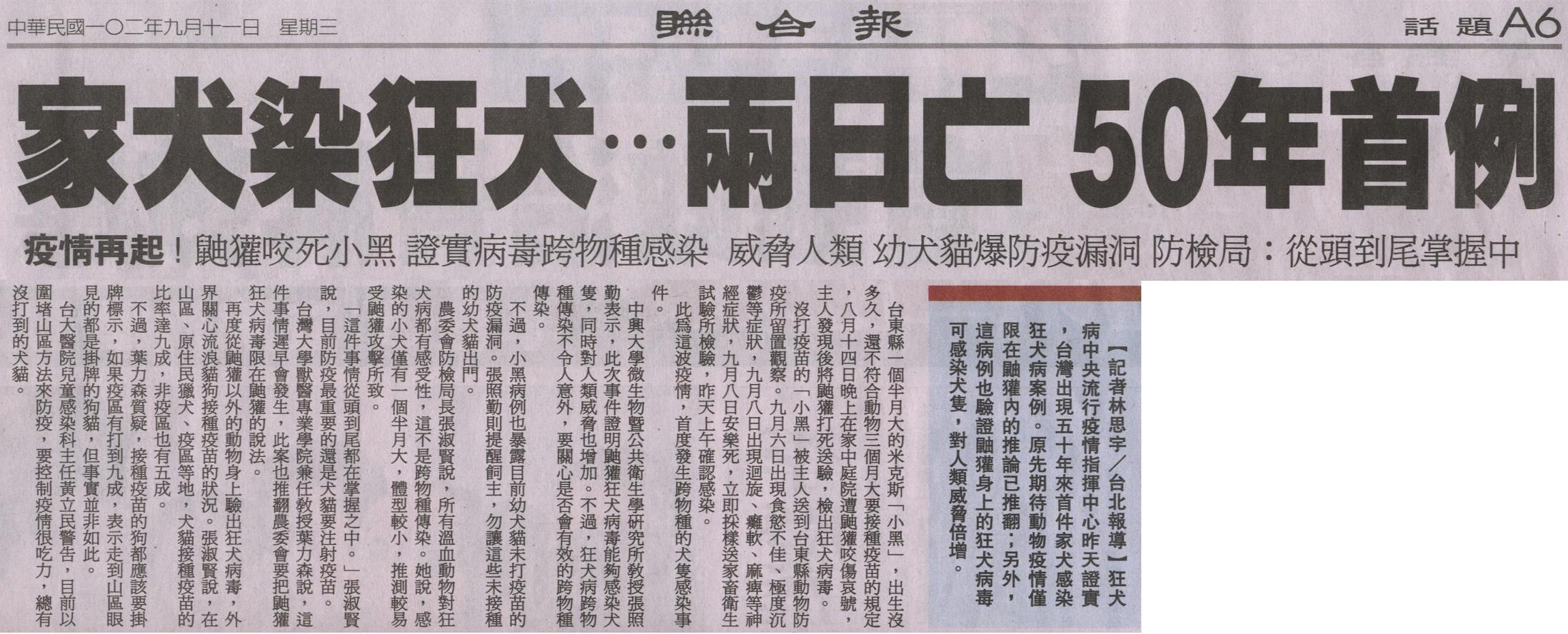 狂犬病中央流行疫情指揮中心昨天證實,台灣出現五十年來首件家犬感染狂犬病案例。原先期待動物疫情僅限在鼬獾內的推論已推翻;另外,這病例也驗證鼬獾身上的狂犬病毒可感染犬隻,對人類威脅倍增。