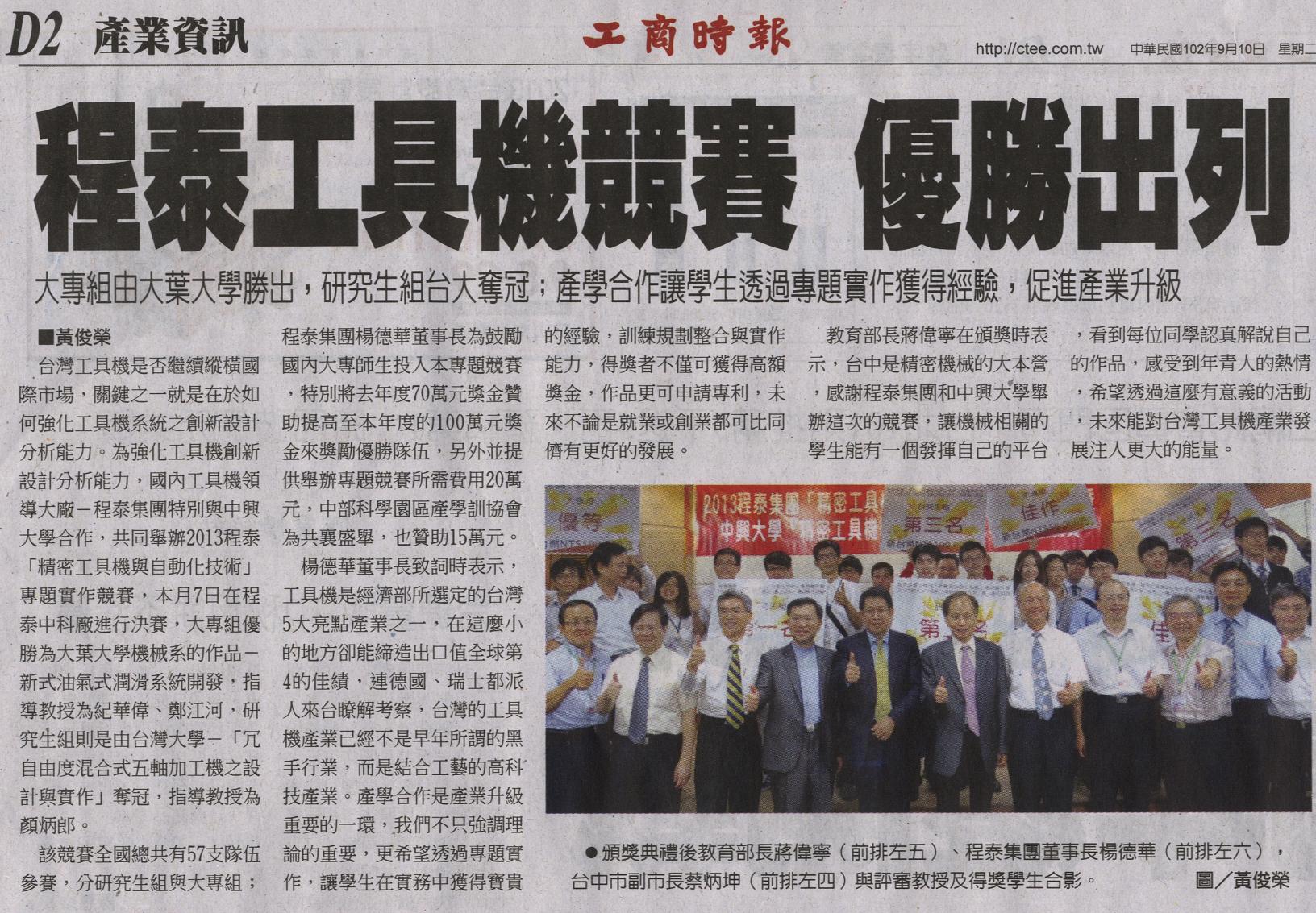 台灣工具機是否繼續縱橫國際市場,關鍵之一就是在於如何強化工 具機系統之創新設計分析能力。為強化工具機創新設計分析能力,國 內工具機領導大廠-程泰集團特別與中興大學合作,共同舉辦2013程 泰「精密工具機與自動化技術」專題實作競賽,本月7日在程泰中科 廠進行決賽,大專組優勝為大葉大學機械系的作品-新式油氣式潤滑 系統開發,指導教授為紀華偉、鄭江河,研究生組則是由台灣大學- 「冗自由度混合式五軸加工機之設計與實作」奪冠,指導教授為顏炳郎。