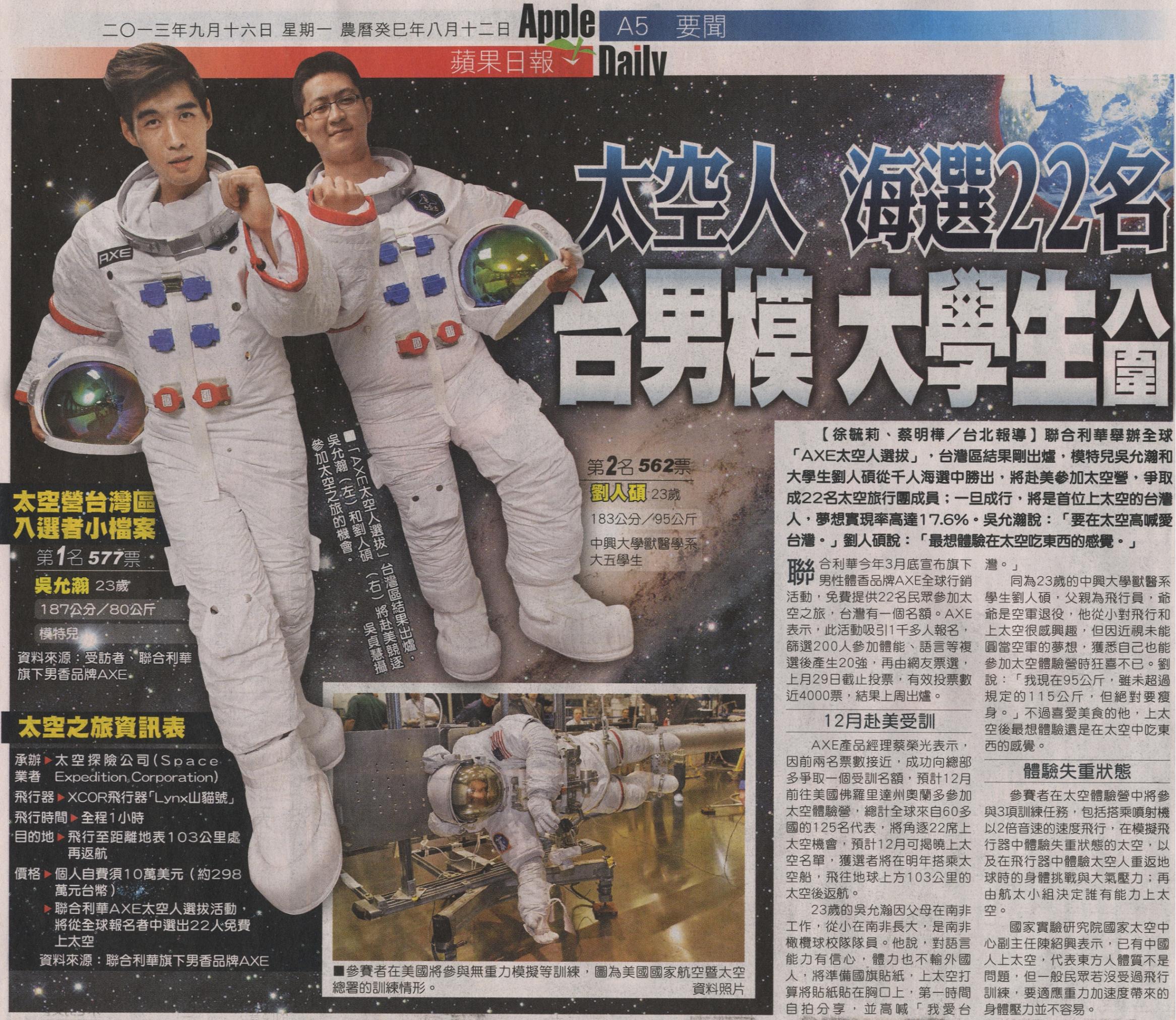 聯合利華舉辦全球「AXE太空人選拔」,台灣區結果剛出爐,模特兒吳允瀚和大學生劉人碩從千人海選中勝出,將赴美參加太空營,爭取成22名太空旅行團成員;一旦成行,將是首位上太空的台灣人,夢想實現率高達17.6%。吳允瀚說:「要在太空高喊愛台灣。」劉人碩說:「最想體驗在太空吃東西的感覺。」