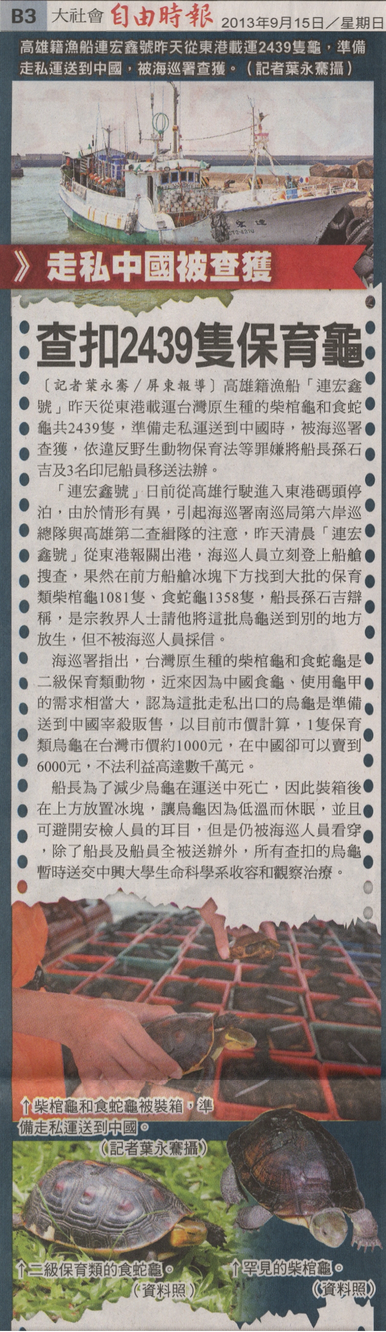 高雄籍漁船「連宏鑫號」昨天從東港載運台灣原生種的柴棺龜和食蛇龜共2439隻,準備走私運送到中國時,被海巡署查獲,依違反野生動物保育法等罪嫌將船長孫石吉及3名印尼船員移送法辦。