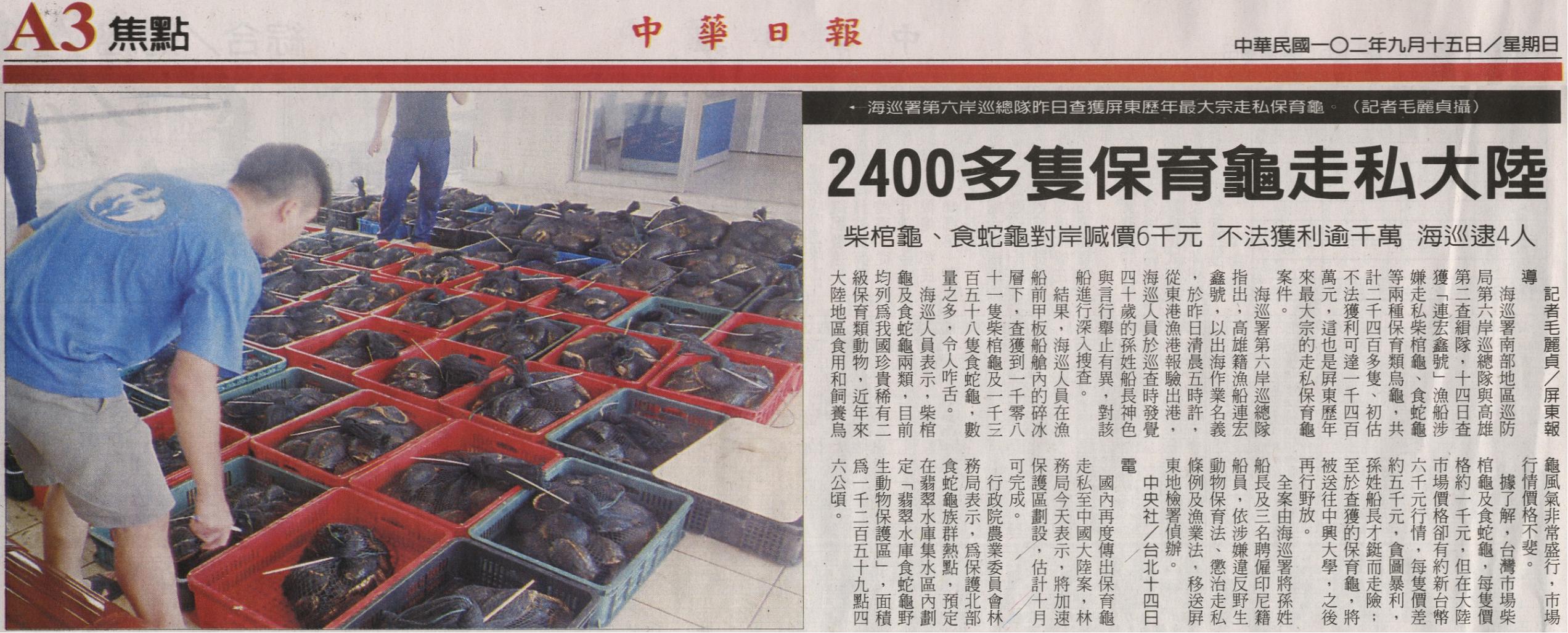 海巡署南部地區巡防局第六岸巡總隊與高雄第二查緝隊,十四日查獲「連宏鑫號」漁船涉嫌走私柴棺龜、食蛇龜等兩種保育類烏龜,共計二千四百多隻、初估不法獲利可達一千四百萬元,這也是屏東歷年來最大宗的走私保育龜案件。