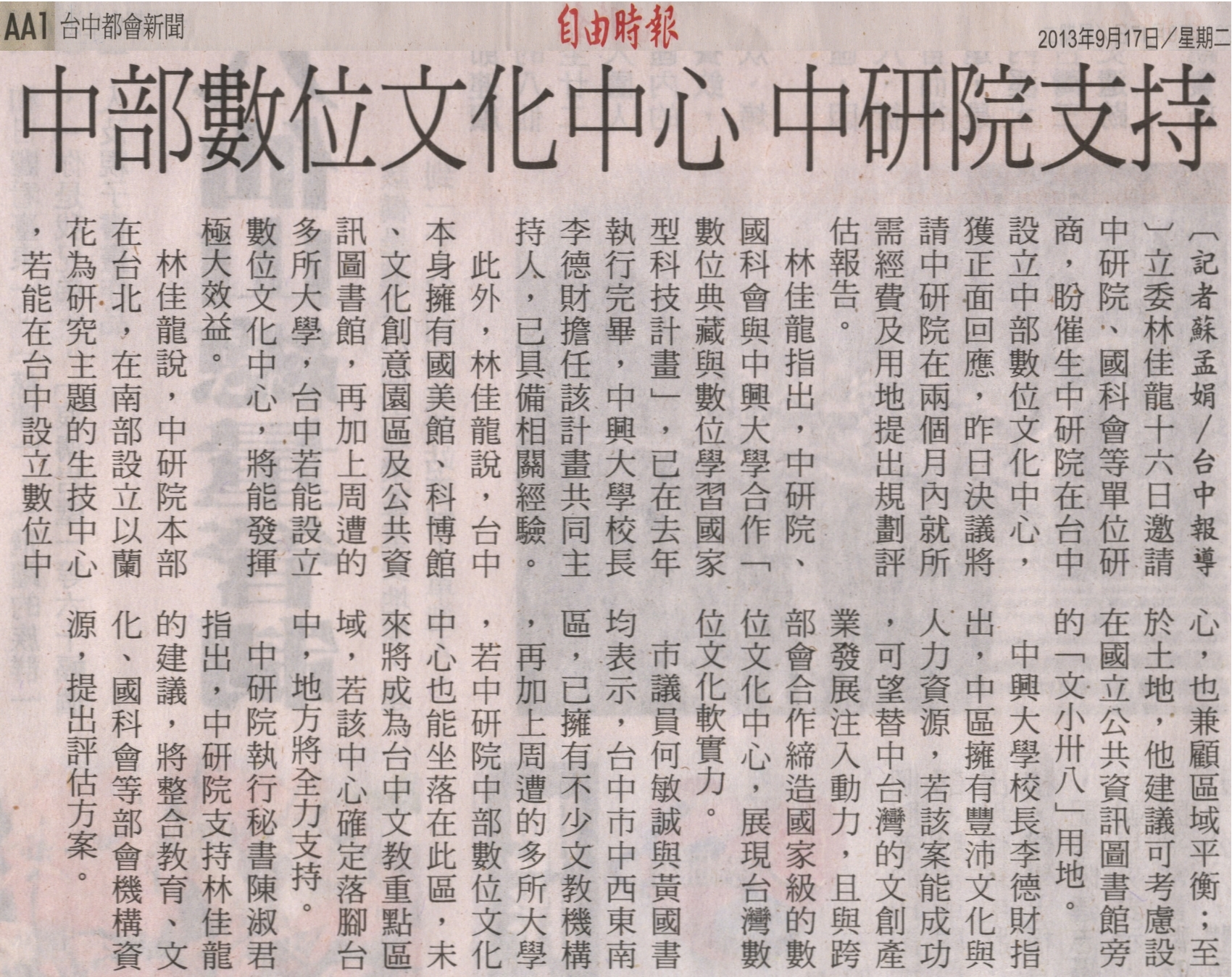 稿源:2013/09/17/自由時報/蘇孟娟/台中