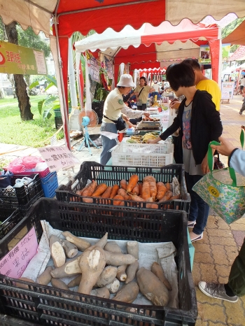 「今天綠色蔬菜比較少哦!」颱風剛過,固定到農夫市集採買的的張太太說,2年前到興大無意間發現這塊寶,從此和先生有了共同尋找樂趣的地方,也開始對有機食材有更多的了解;她能評鑑哪家高麗菜最甜、誰的地瓜最鬆軟。