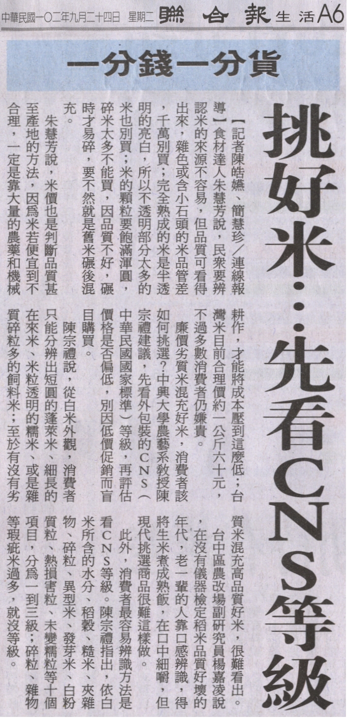 此外,消費者最容易辨識方法是看CNS等級。陳宗禮指出,依白米所含的水分、稻穀、糙米、夾雜物、碎粒、異型米、發芽米、白粉質粒、熱損害粒、未變糯粒等十個項目,分為一到三級;碎粒、雜物等瑕疵米過多,就沒等級。