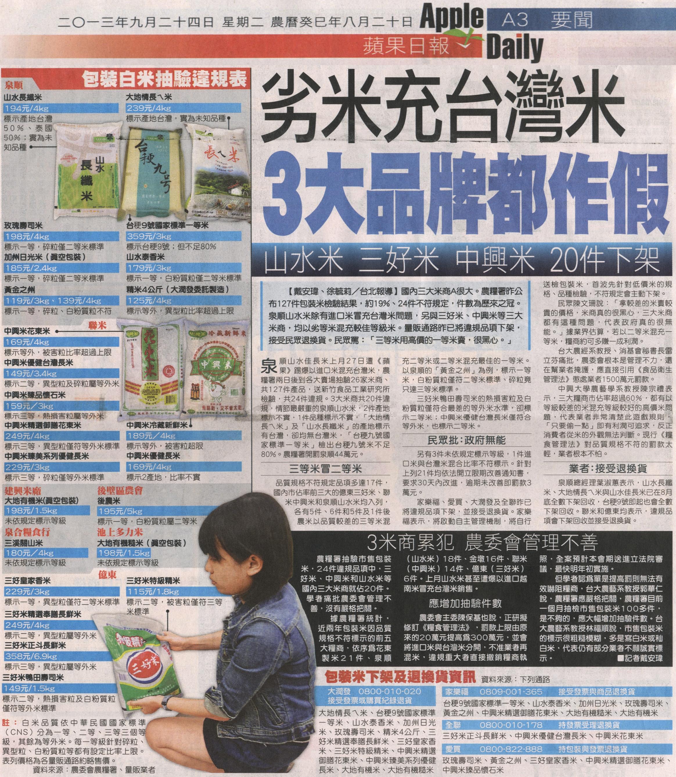 國內三大米商A很大。農糧署昨公布127件包裝米檢驗結果,約19%、24件不符規定,件數為歷來之冠。泉順山水米除有進口米冒充台灣米問題,另與三好米、中興米等三大米商,均以劣等米混充較佳等級米。量販通路昨已將違規品項下架,接受民眾退換貨。民眾罵:「三等米用高價的一等米賣,很黑心。」
