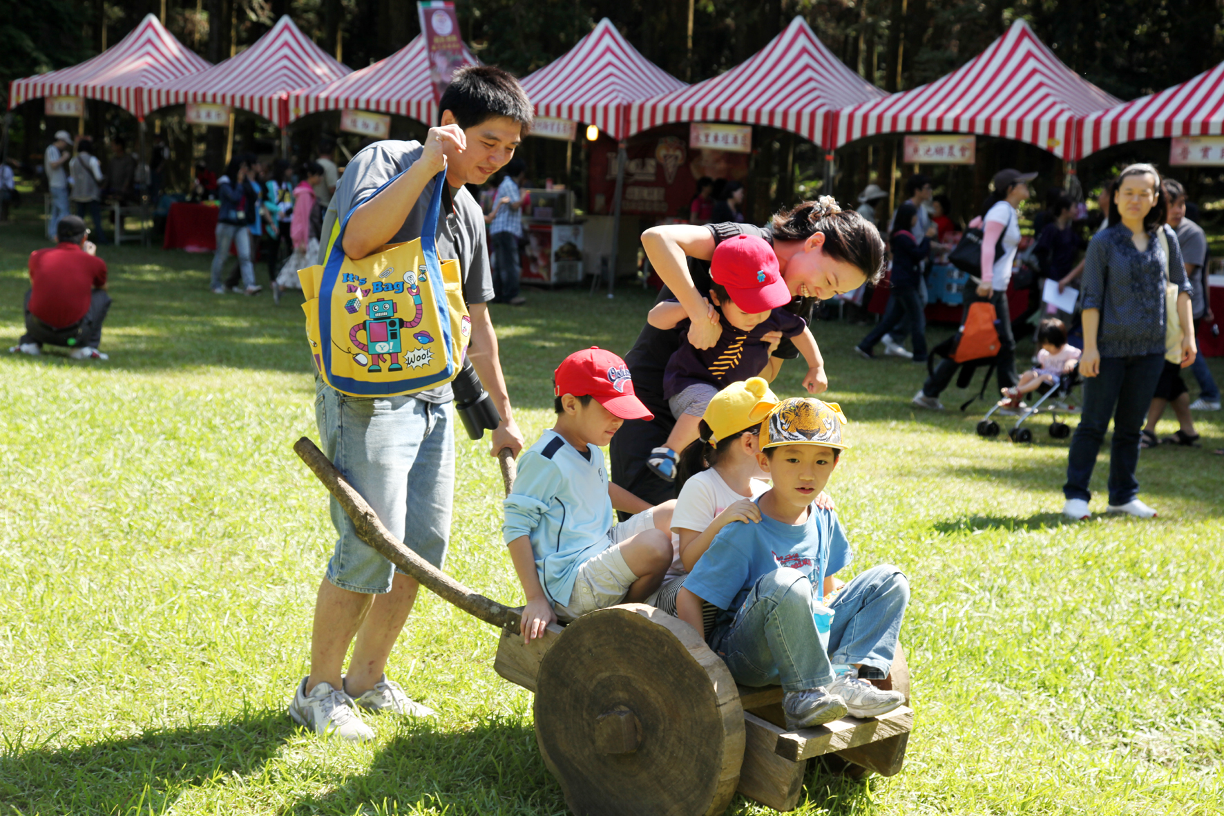 小孩開心地坐上木製推車在草地上玩耍。