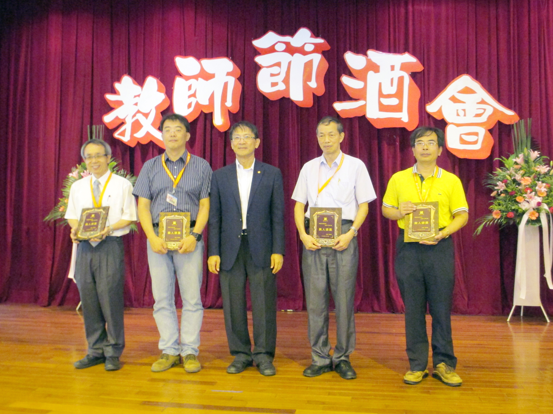 李校長(中)頒發2013年「興人師獎」,得主左至右為外文系吳黌銘副教授、森林系曾彥學副教授、園藝系林慧玲教授、昆蟲系黃紹毅教授。