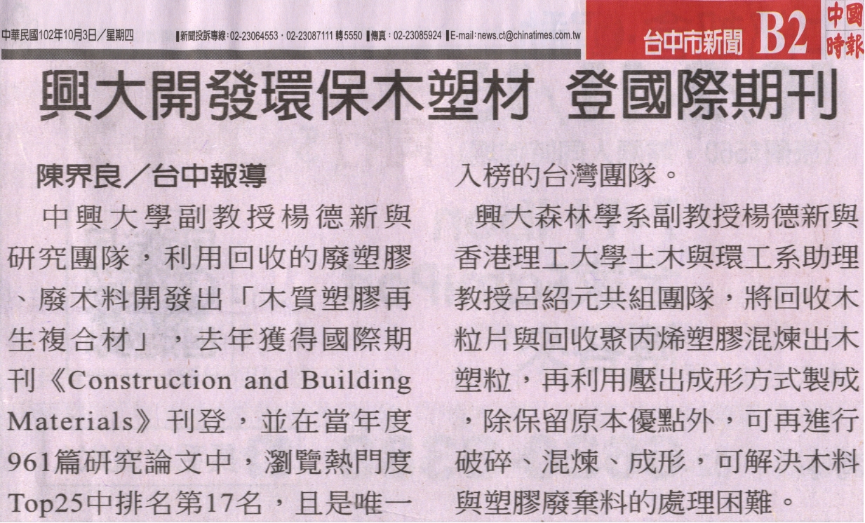 【媒體報導】興大開發環保木塑材 登國際期刊
