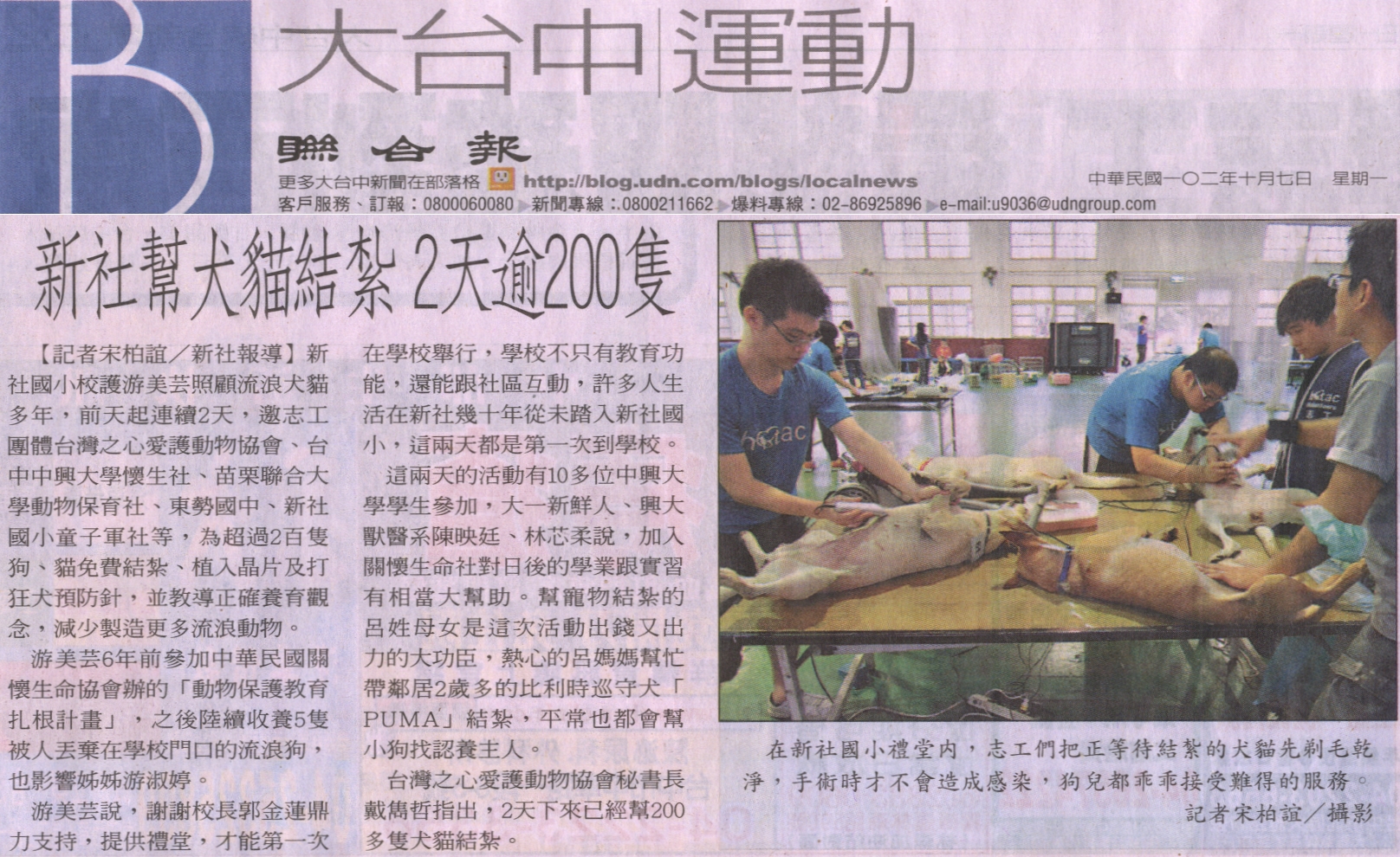 新社國小校護游美芸照顧流浪犬貓多年,前天起連續2天,邀志工團體台灣之心愛護動物協會、台中中興大學懷生社、苗栗聯合大學動物保育社、東勢國中、新社國小童子軍社等,為超過2百隻狗、貓免費結紮、植入晶片及打狂犬預防針,並教導正確養育觀念,減少製造更多流浪動物。