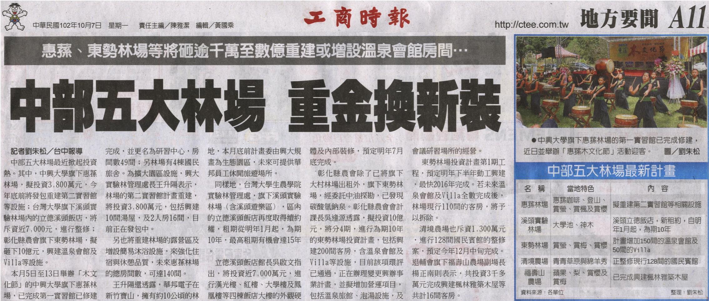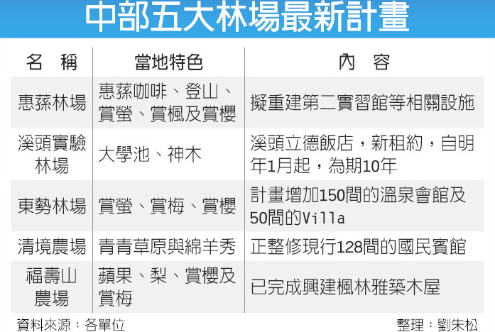 中部五大林場最近掀起投資熱。其中,中興大學旗下惠蓀林場,擬投資3,800萬元,今年底前將發包重建第二實習館等設施;台灣大學旗下溪頭實驗林場內的立德溪頭飯店,將斥資近7,000元,進行整修;彰化縣農會旗下東勢林場,擬砸下10億元,興建溫泉會館及Villa等設施。