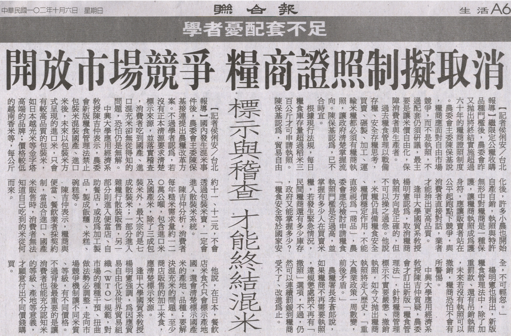 逢甲大學國貿系教授楊明憲強調,為因應貿易自由化及世界貿易組織(WTO)規範,對市場的種種干預、扭曲做法勢必調整,走向市場競爭機制讓不同米質、等級,有不同價格。不過背後最重要的是讓消費者也能充分認知米的等級、產地等意義,才願意付出不同價錢購買。