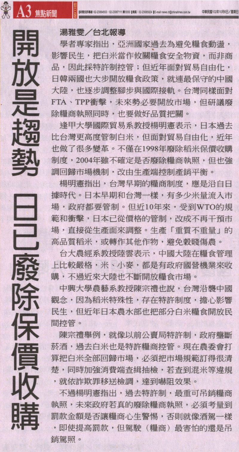 中興大學農藝系教授陳宗禮也說,台灣沿襲中國觀念,因為稻米特 殊性,存在特許制度,擔心影響民生,但近年日本農水部也把部分白 米糧食開放民間控管。