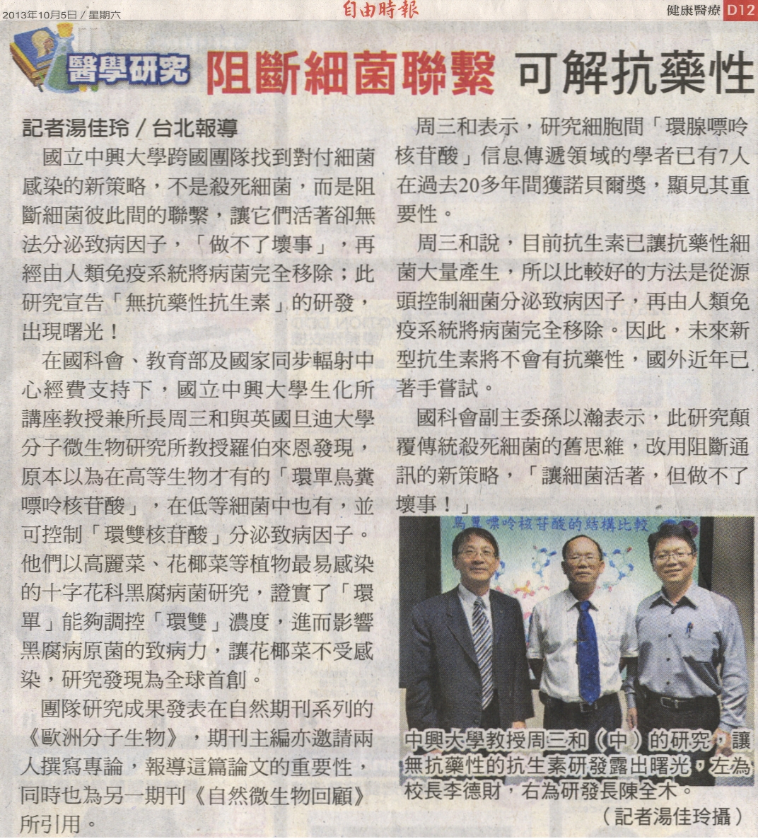 在國科會、教育部及國家同步輻射中心經費支持下,國立中興大學生化所講座教授兼所長周三和與英國旦迪大學分子微生物研究所教授羅伯來恩發現,原本以為在高等生物才有的「環單鳥糞嘌呤核苷酸」,在低等細菌中也有,並可控制「環雙核苷酸」分泌致病因子。他們以高麗菜、花椰菜等植物最易感染的十字花科黑腐病菌研究,證實了「環單」能夠調控「環雙」濃度,進而影響黑腐病原菌的致病力,讓花椰菜不受感染,研究發現為全球首創。