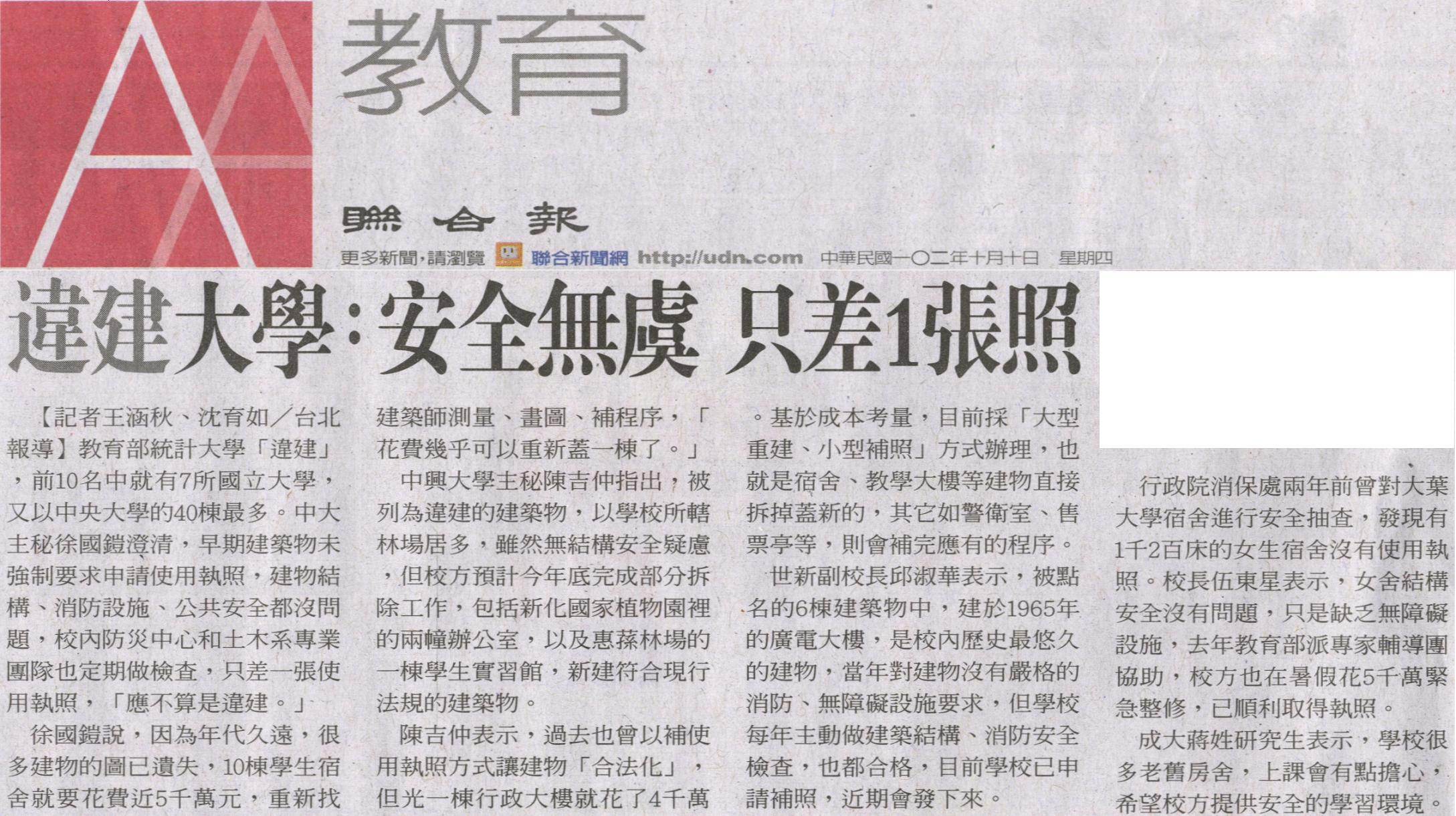世新副校長邱淑華表示,被點名的6棟建築物中,建於1965年的廣電大樓,是校內歷史最悠久的建物,當年對建物沒有嚴格的消防、無障礙設施要求,但學校每年主動做建築結構、消防安全檢查,也都合格,目前學校已申請補照,近期會發下來。