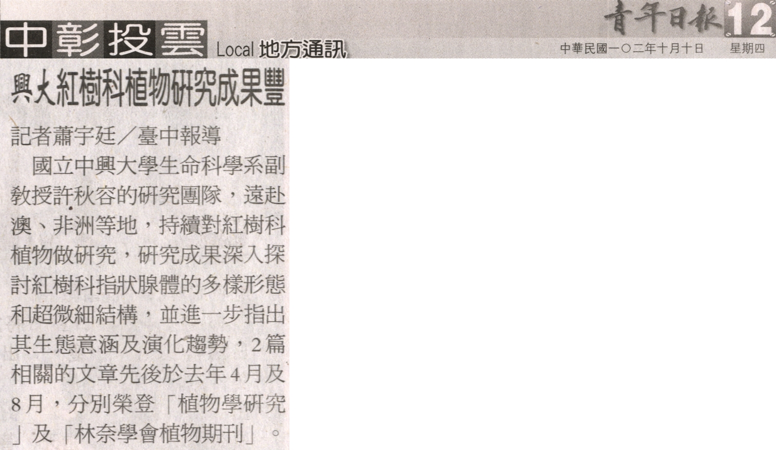 【媒體報導】興大紅樹科植物研究成果豐