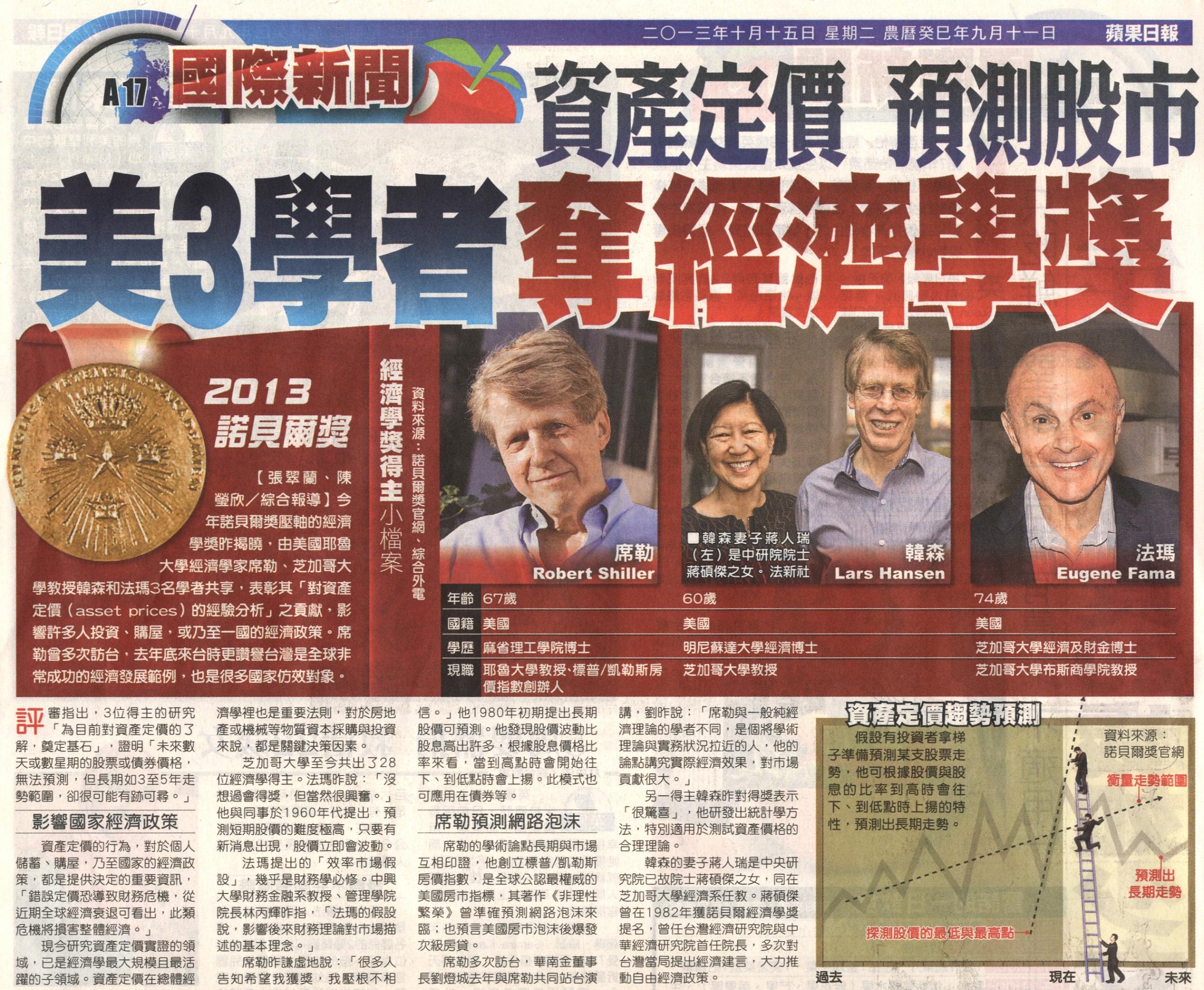 評審指出,3位得主的研究「為目前對資產定價的了解,奠定基石」,證明「未來數天或數星期的股票或債券價格,無法預測,但長期如3至5年走勢範圍,卻很可能有跡可尋。」