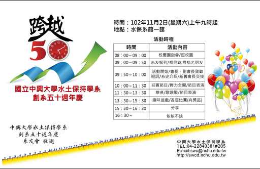 此次為舉辦「創系50週年慶祝活動」,興大水保系將發表籌備已久的系史,並號召各屆畢業生回娘家,在校的學弟妹們也精心籌畫了水保主題的闖關活動及節目表演,讓系友們闔家歡樂!也為中興大學的校慶增添光彩。活動詳情請參閱興大水保系網頁:http://swcdis.nchu.edu.tw/,或電洽04-22840381轉206王小姐