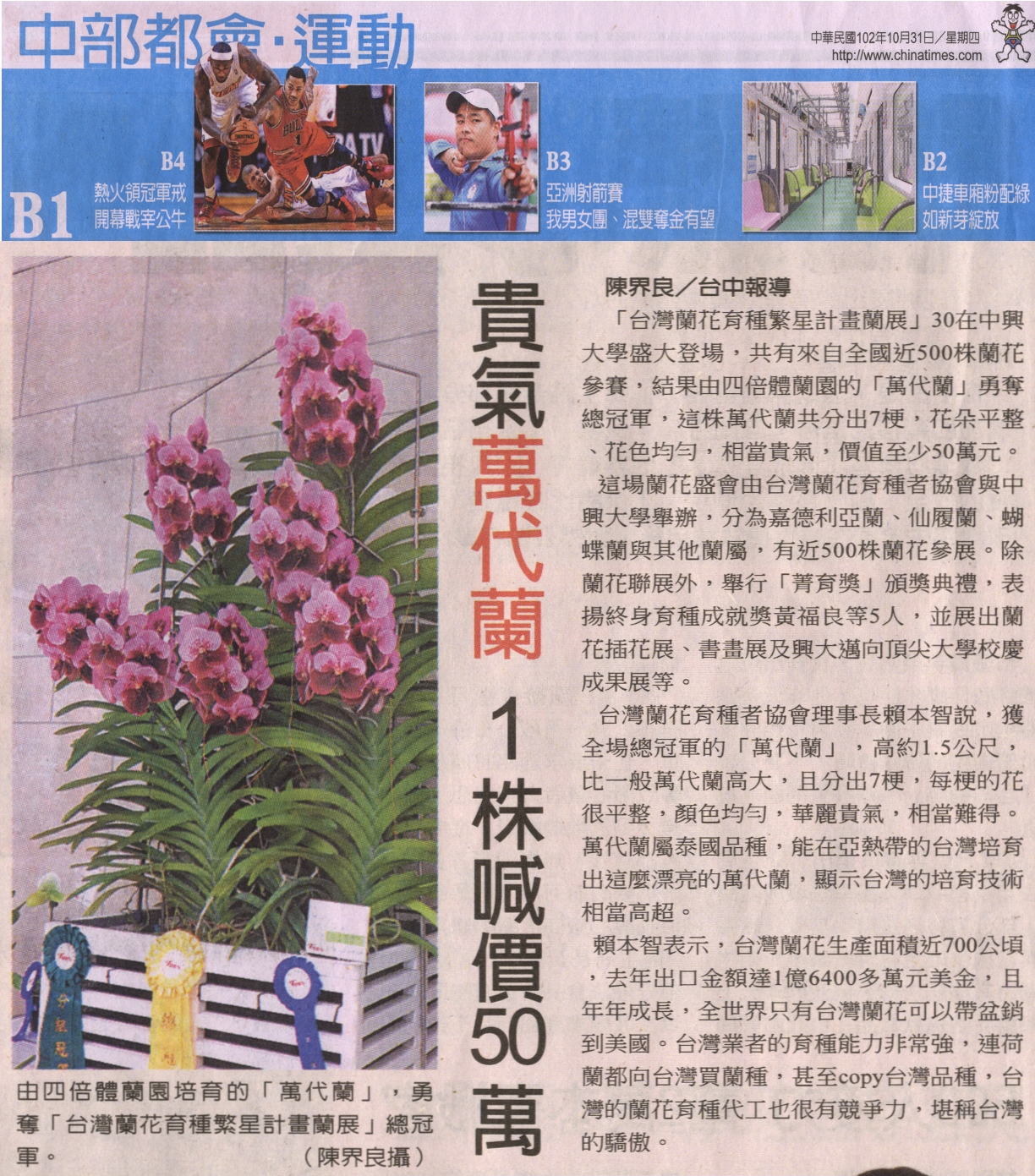 【媒體報導】貴氣萬代蘭 1株喊價50萬