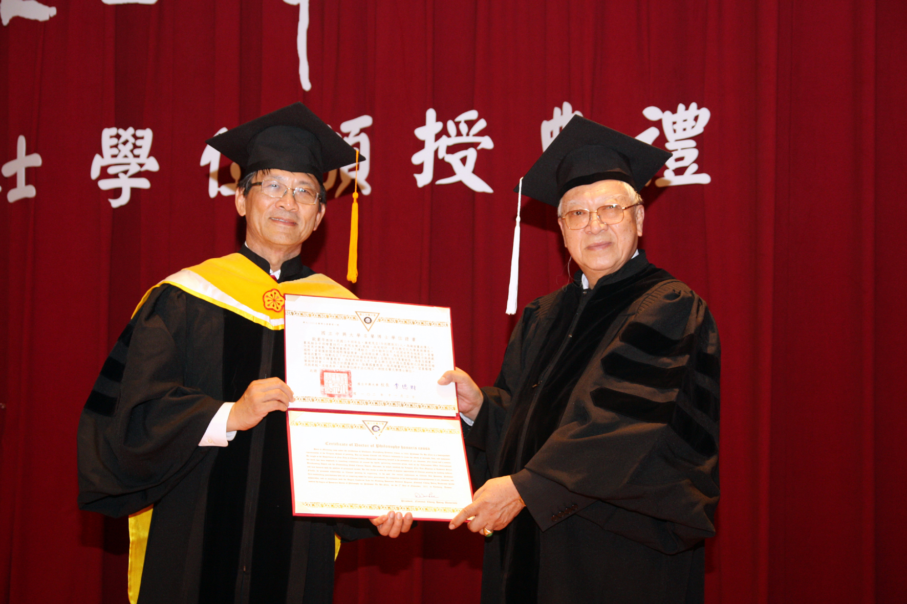 國畫大師歐豪年(右)獲中興大學名譽文學博士學位,由中興大學校長李德財(左)頒發學位證書。