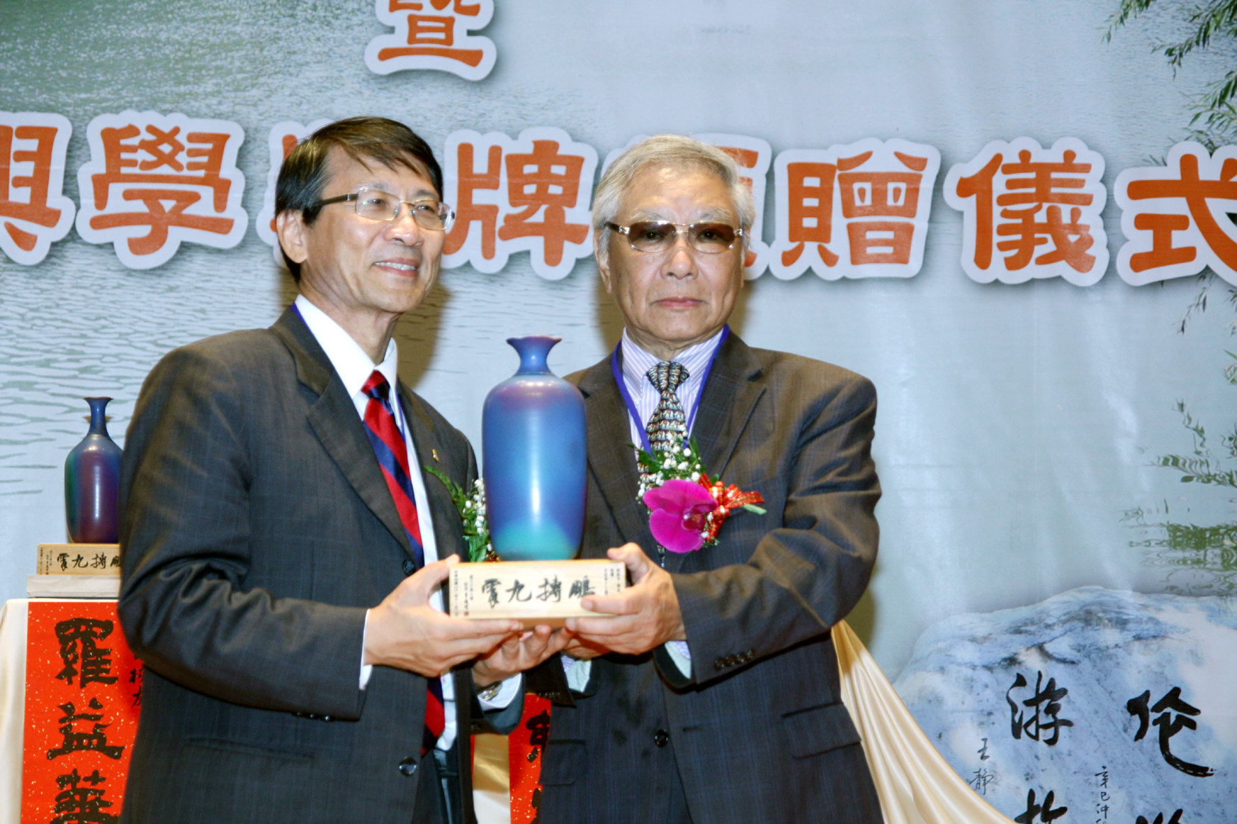 鄭愁予(右)獲選為中興大學傑出校友,由興大校長李德財頒獎。 |