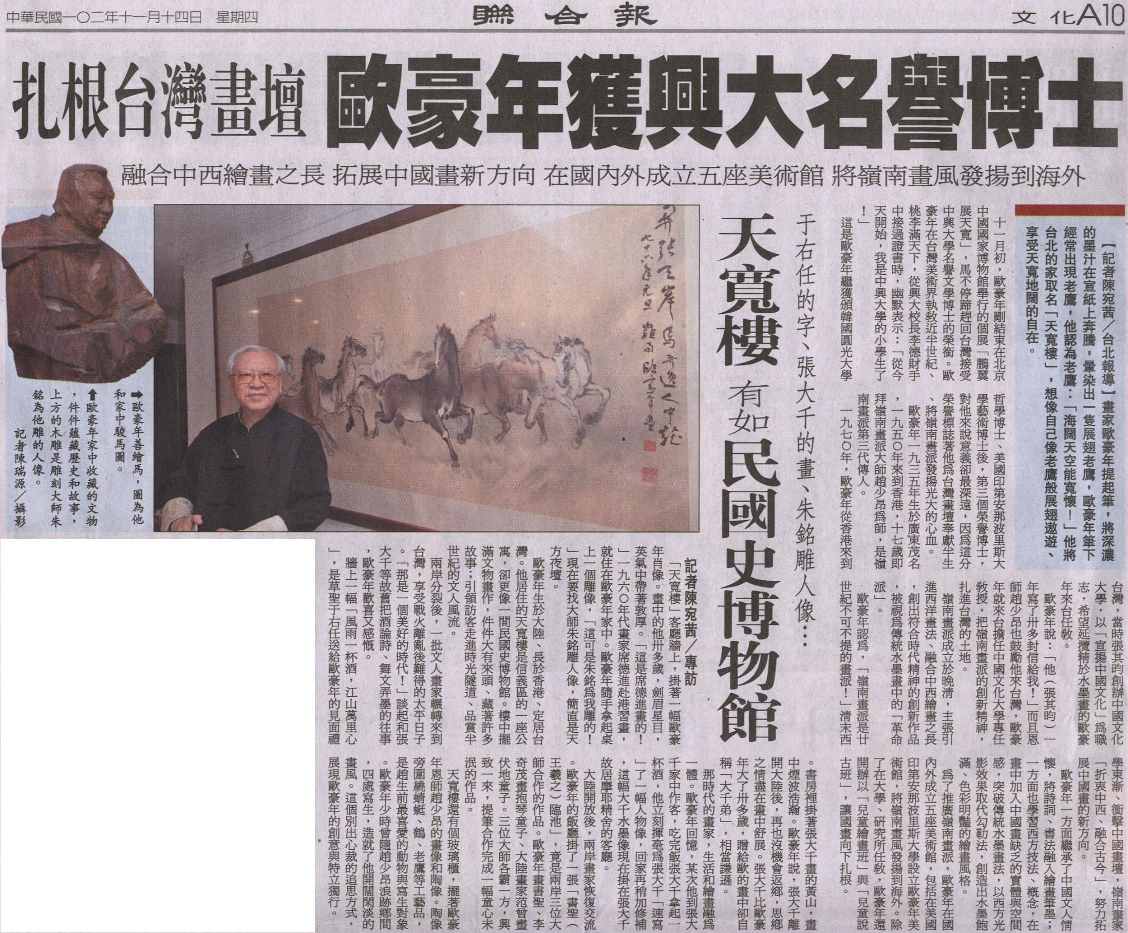 十一月初,歐豪年剛結束在北京中國國家博物館舉行的個展「鵬翼展天寬」,馬不停蹄趕回台灣接受中興大學名譽文學博士的榮銜。歐豪年在台灣美術界執教近半世紀、桃李滿天下,從興大校長李德財手中接過證書時,幽默表示:「從今天開始,我是中興大學的小學生了!」