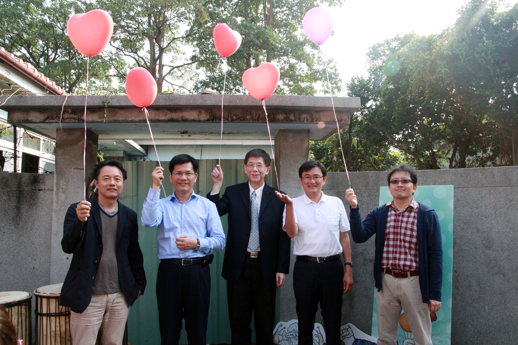 開市記者會上,徐堯煇副校長(中)、歐聖榮學務長(左1)、蔡岡廷副教授(右1)、立委林佳龍(左2)、議員黃國書(右2)一同在弄巷的圍牆上放上紅氣球,為老舊空間點新妝。