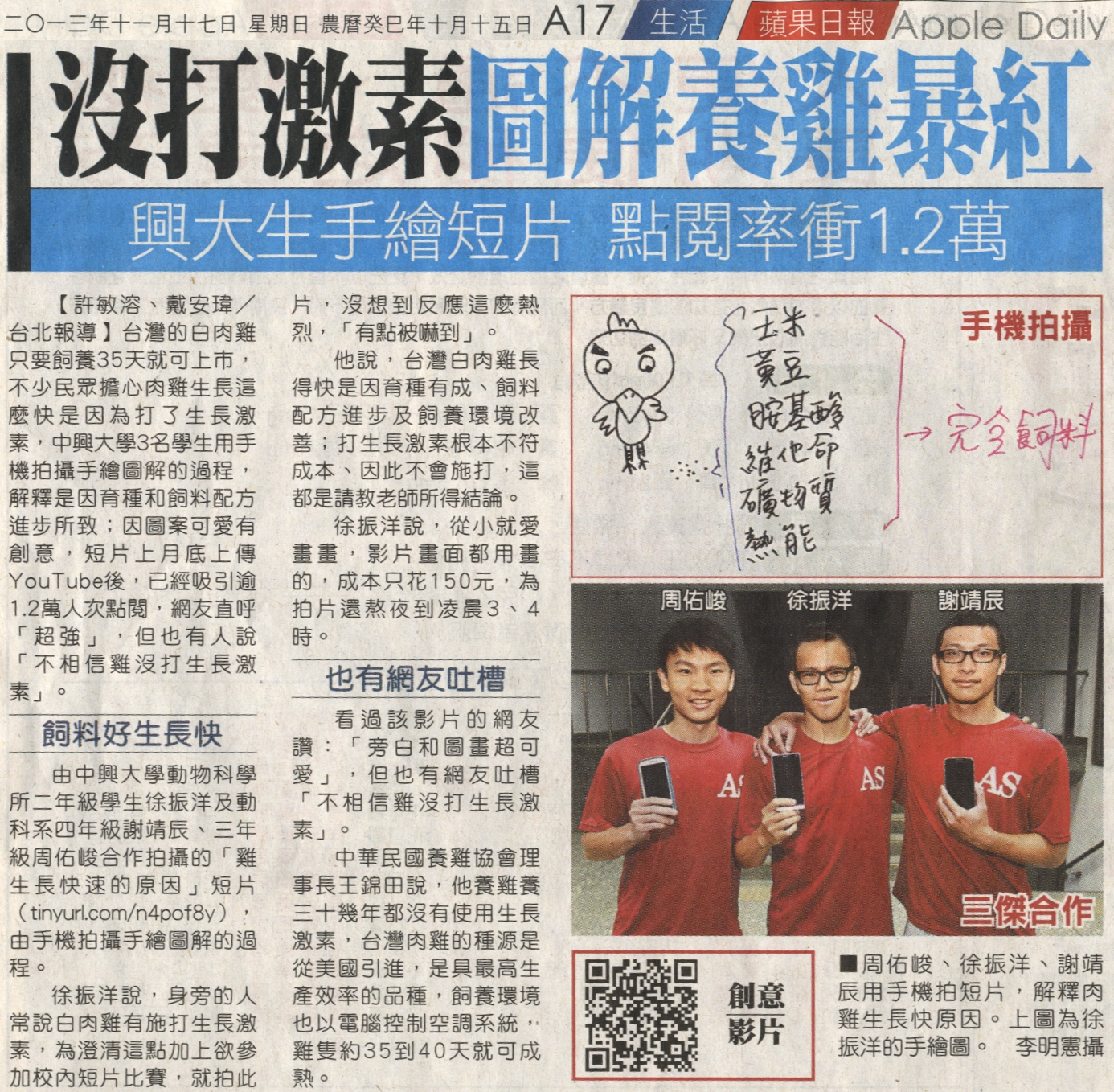 台灣的白肉雞只要飼養35天就可上市,不少民眾擔心肉雞生長這麼快是因為打了生長激素,中興大學3名學生用手機拍攝手繪圖解的過程,解釋是因育種和飼料配方進步所致;因圖案可愛有創意,短片上月底上傳YouTube後,已經吸引逾1.2萬人次點閱,網友直呼「超強」,但也有人說「不相信雞沒打生長激素」。