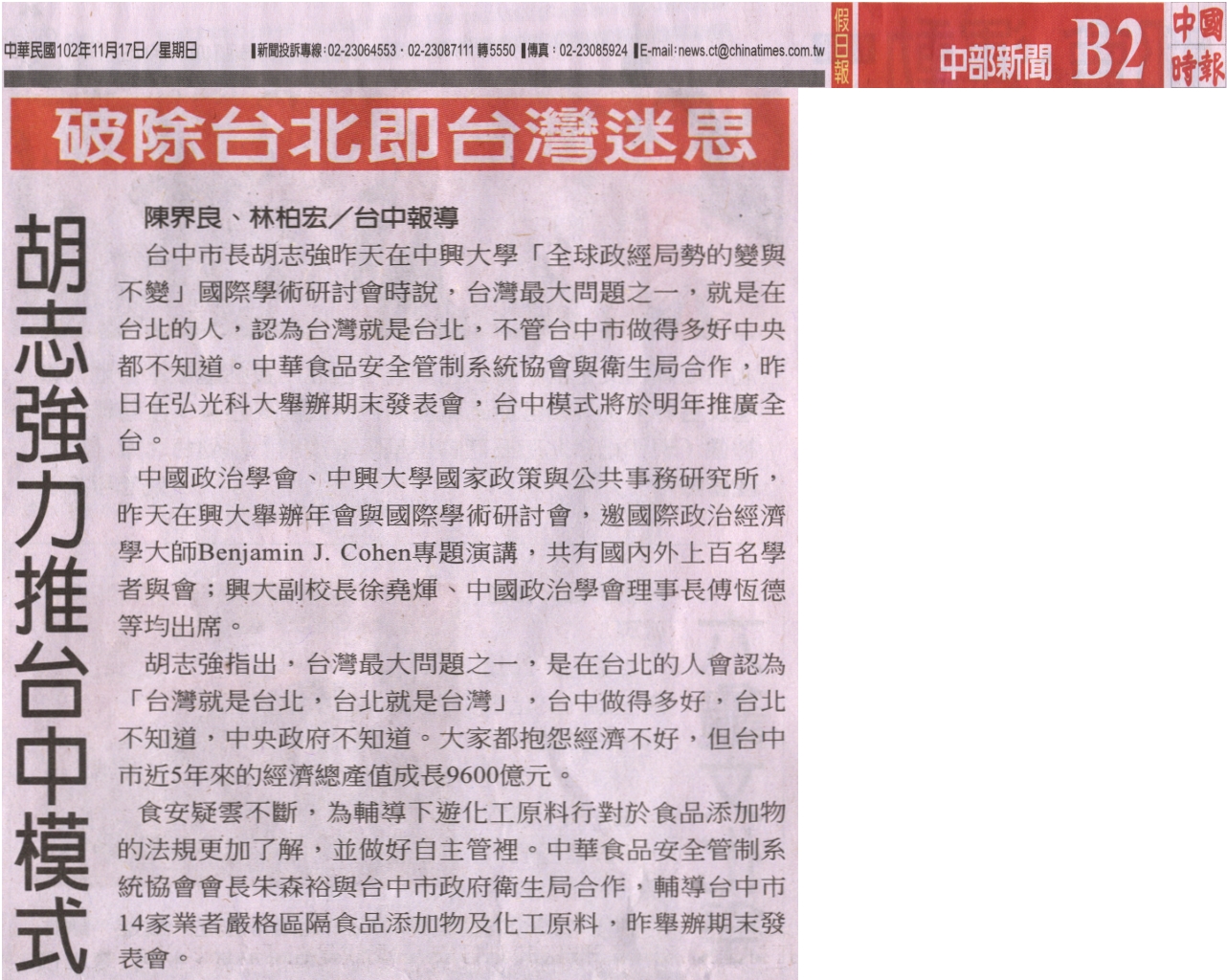 【媒體報導】破除台北即台灣迷思 胡志強力推台中模式