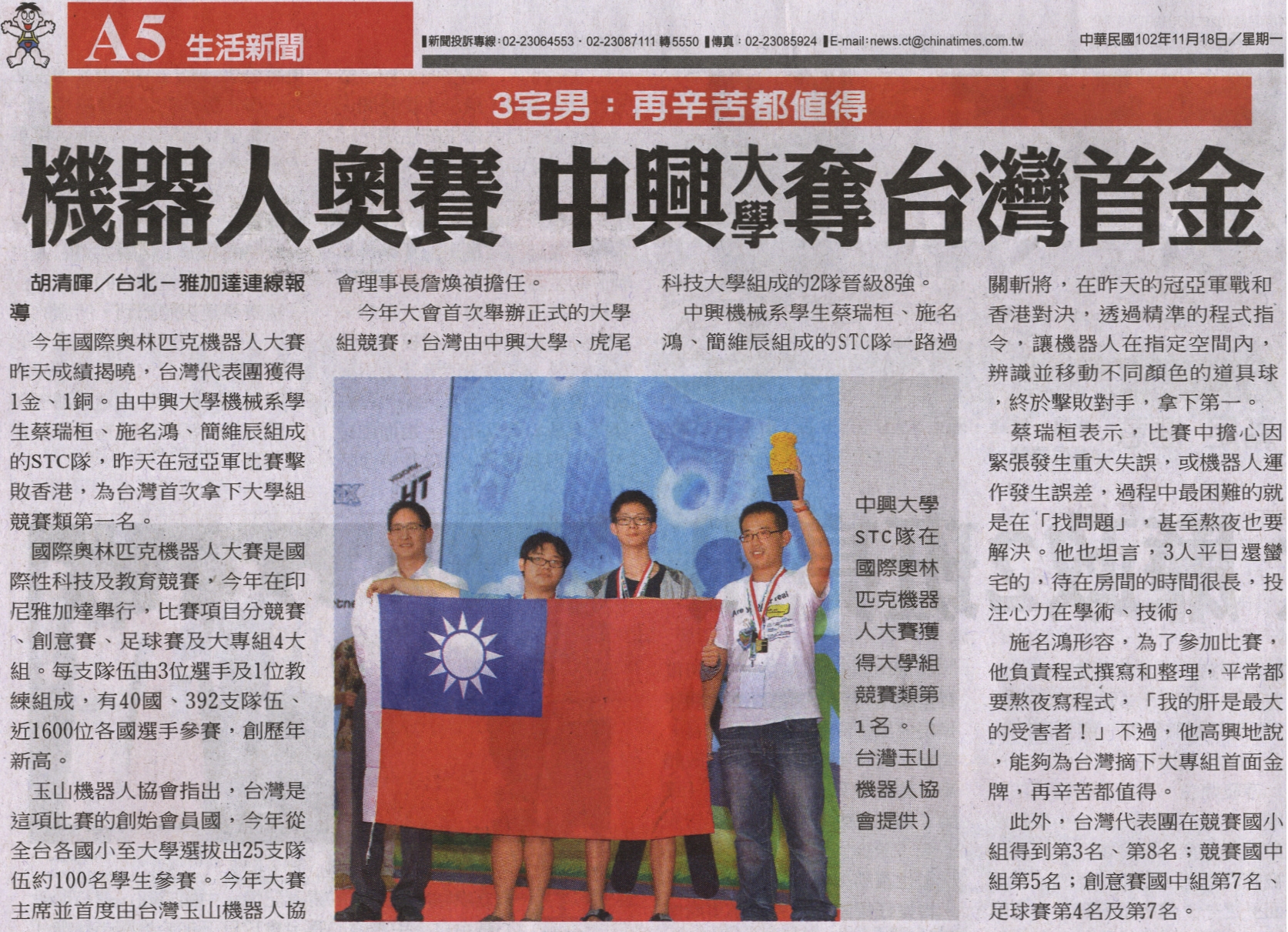 3宅男:再辛苦都值得 機器人奧賽 中興大學奪台灣首金