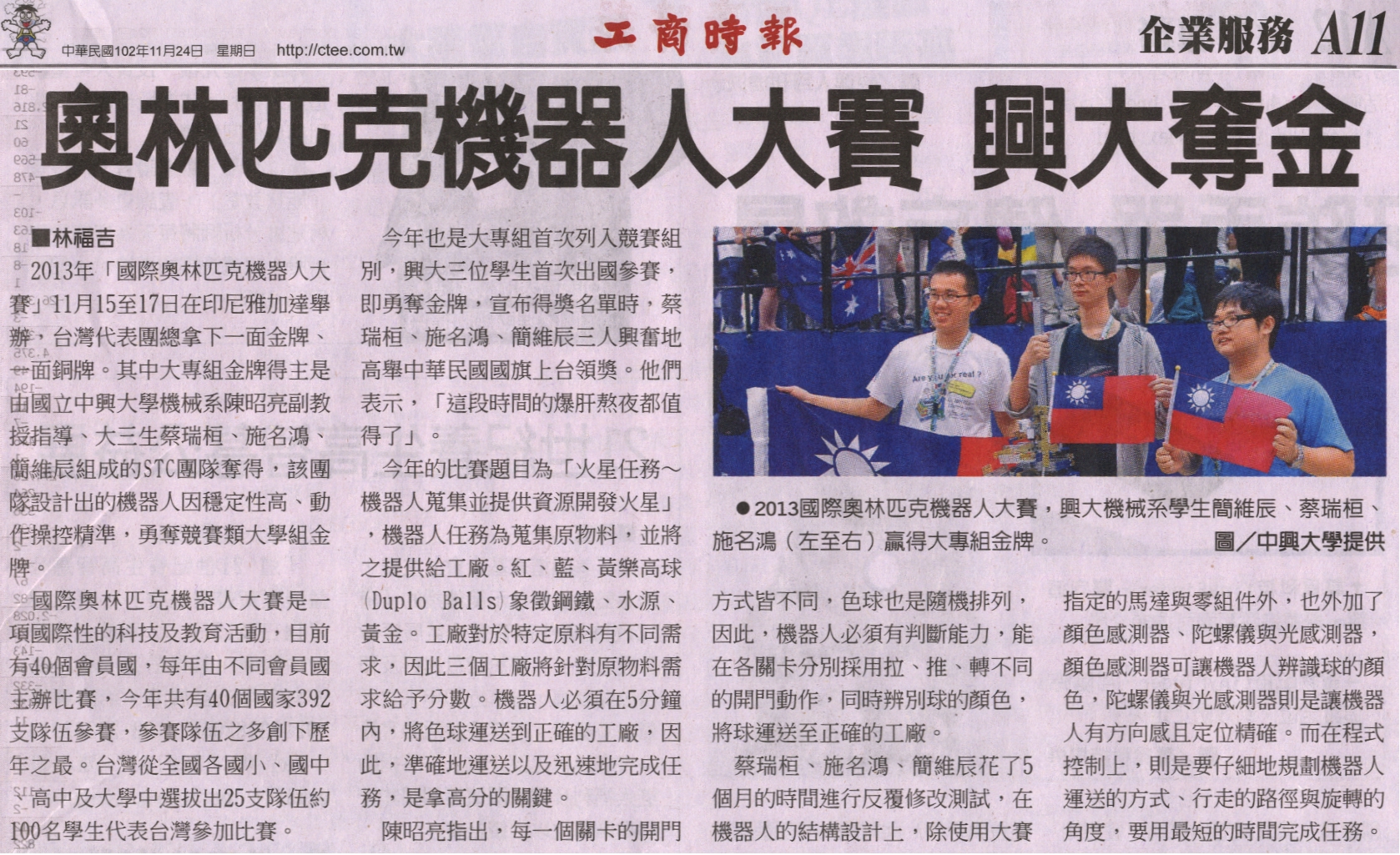 2013年「國際奧林匹克機器人大賽」11月15至17日在印尼雅加達舉辦,台灣代表團總拿下一面金牌、一面銅牌。其中大專組金牌得主是由國立中興大學機械系陳昭亮副教授指導、大三生蔡瑞桓、施名鴻、簡維辰組成的STC團隊奪得,該團隊設計出的機器人因穩定性高、動作操控精準,勇奪競賽類大學組金牌。