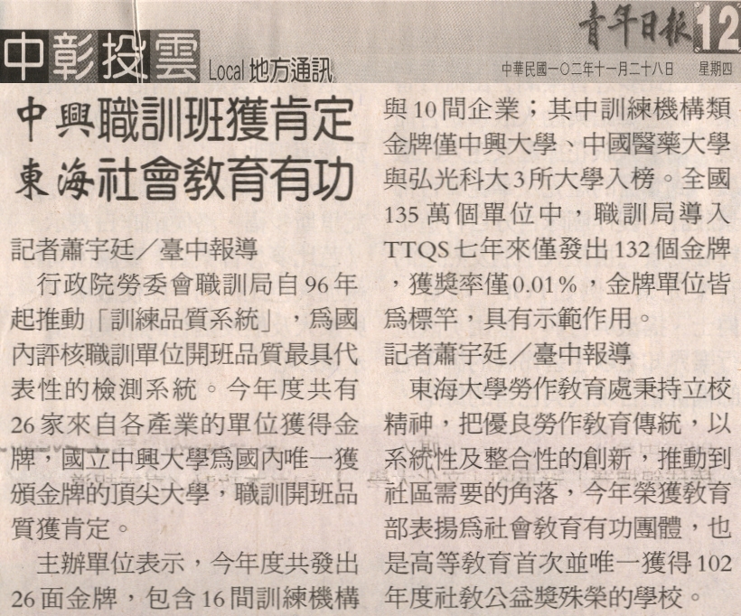 【媒體報導】中興職訓班獲肯定 東海社會教育有功