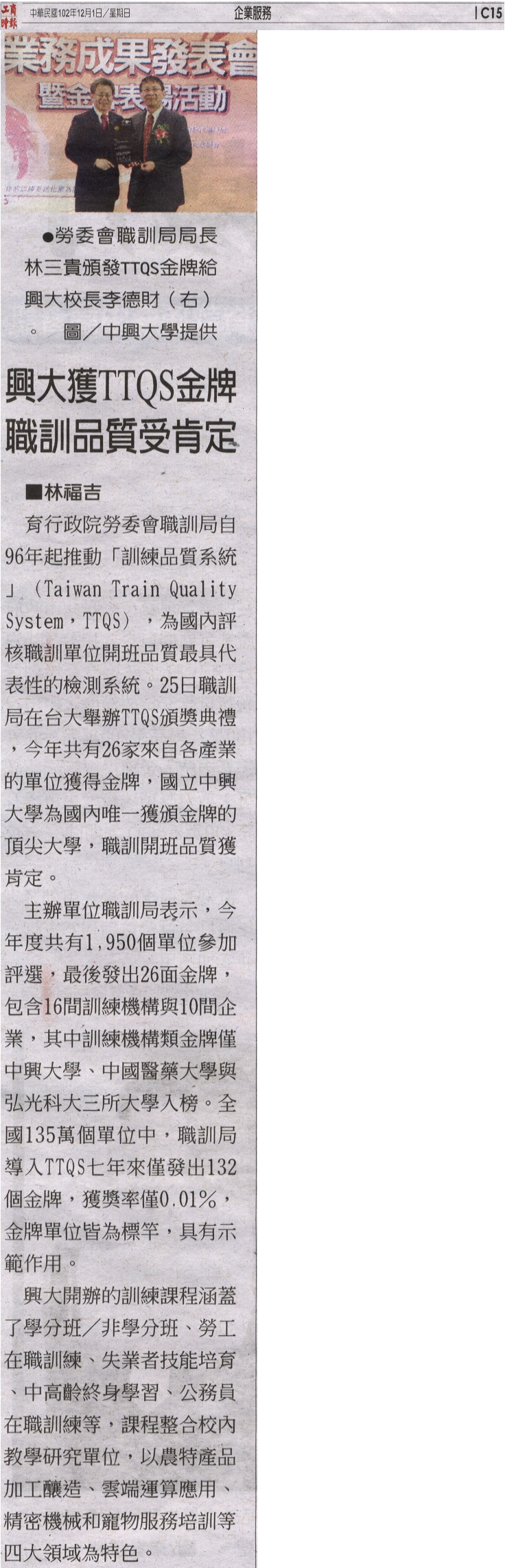 【媒體報導】興大獲TTQS金牌 職訓品質受肯定