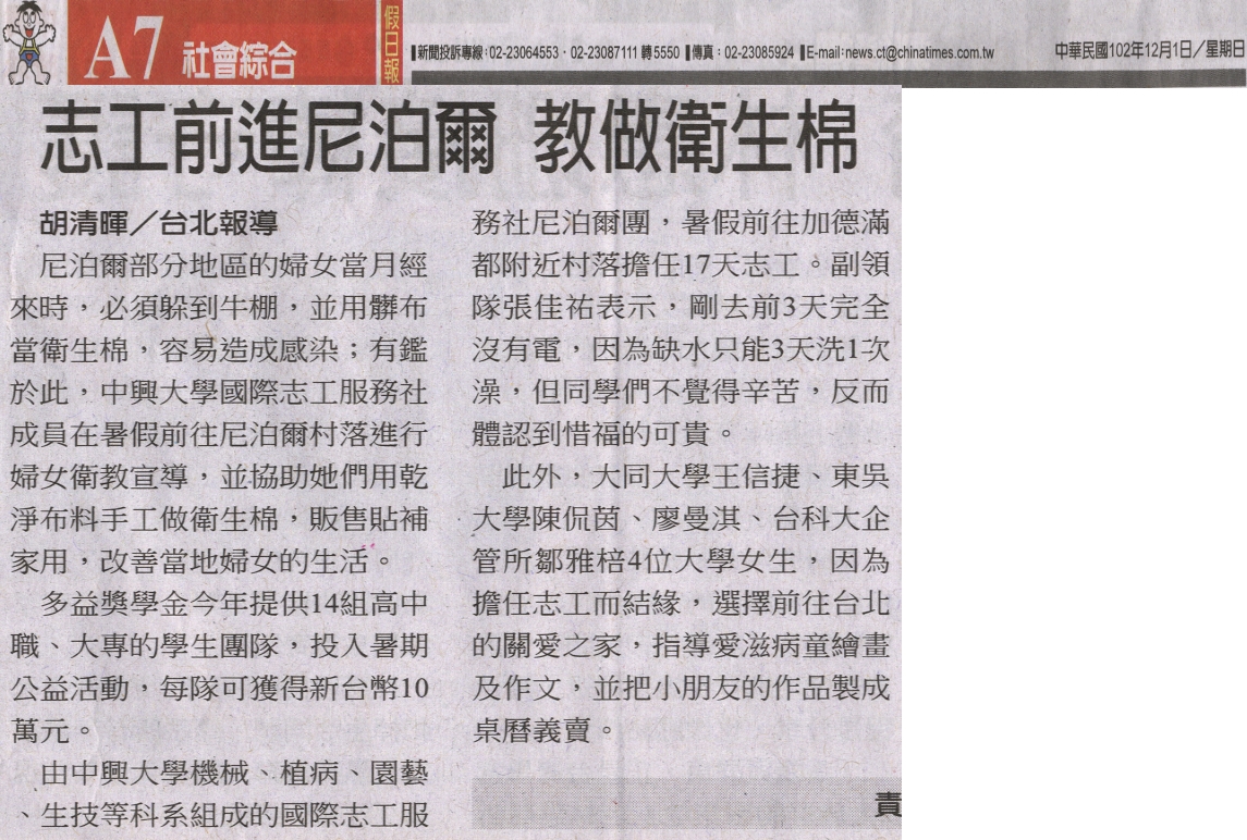 【媒體報導】志工前進尼泊爾 教做衛生棉
