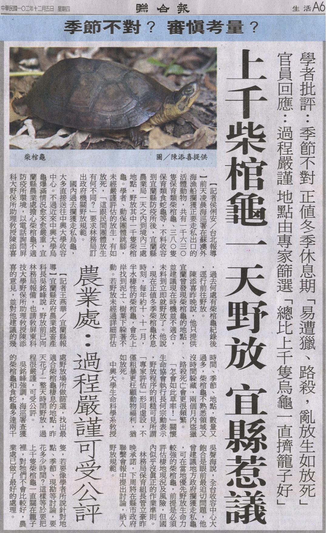 學者批評:季節不對 正值冬季休息期 「易遭獵、路殺,亂放生如放死」官員回應:過程嚴謹 地點由專家篩選 「總比上千隻烏龜一直擠籠子好」