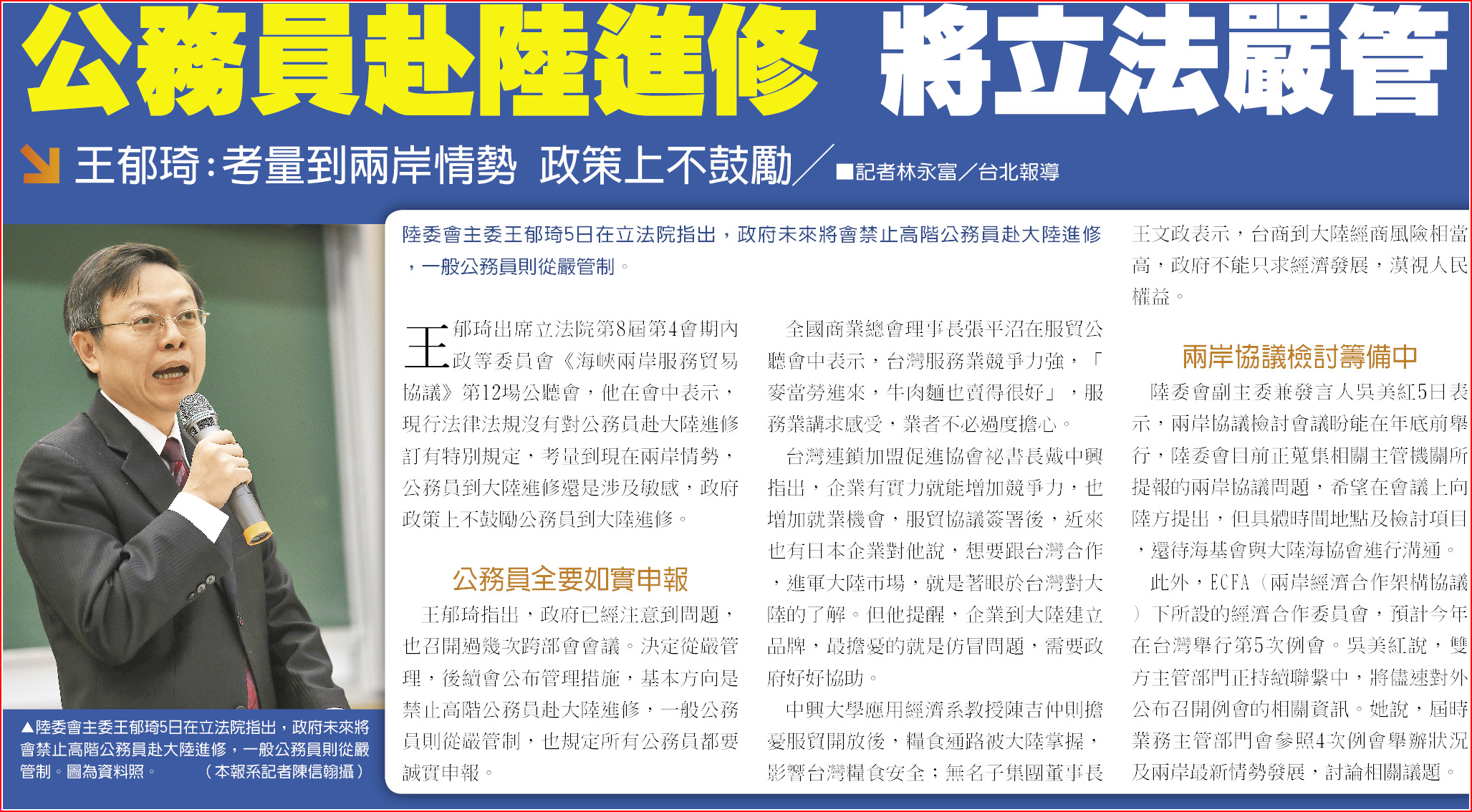 陸委會主委王郁琦5日在立法院指出,政府未來將會禁止高階公務員赴大陸進修,一般公務員則從嚴管制。