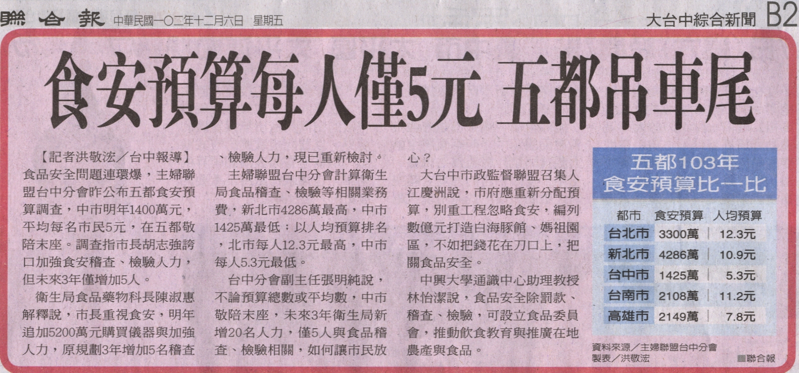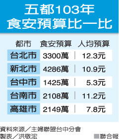 【媒體報導】中市食安預算每人僅5元 五都吊車尾
