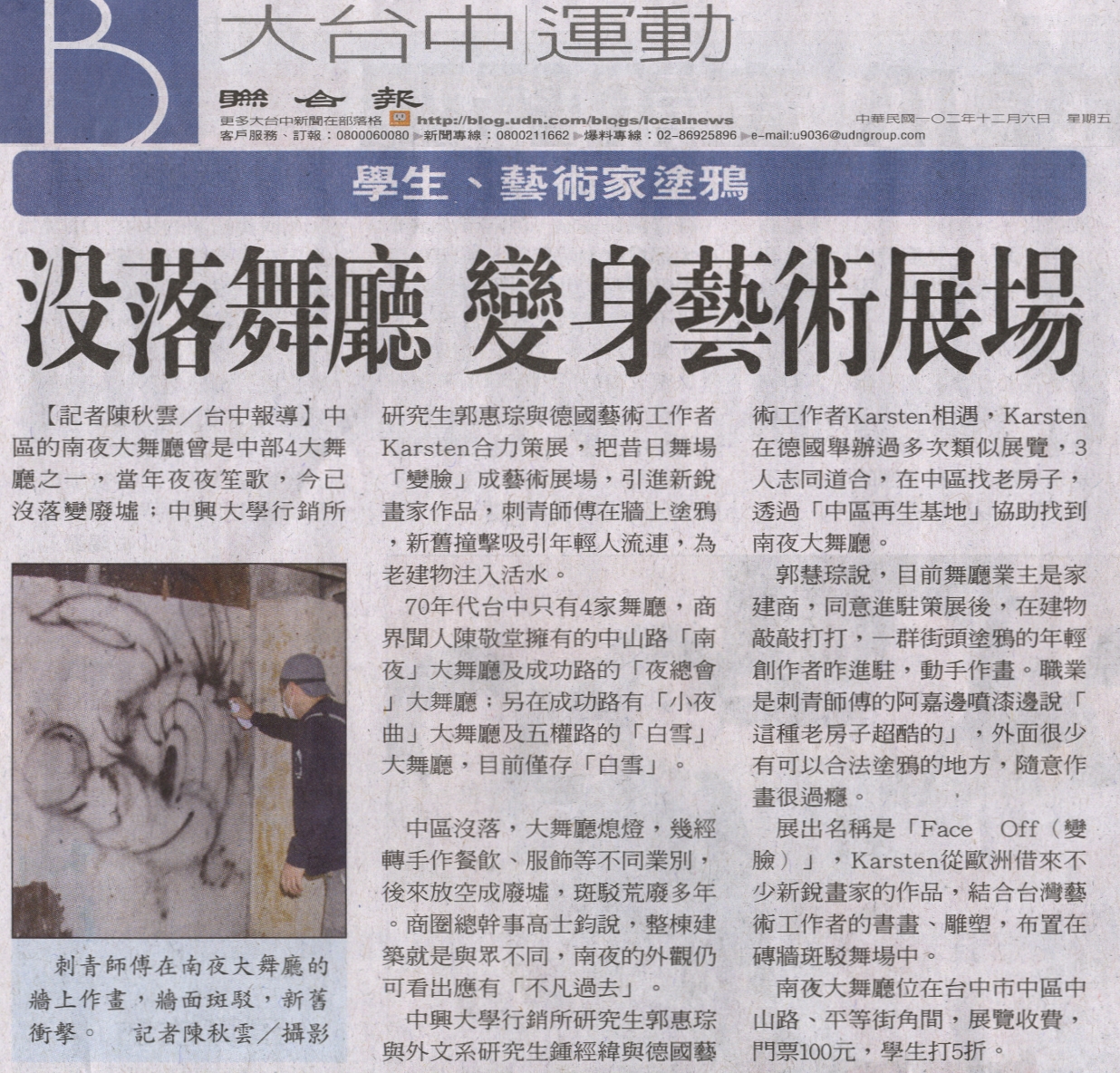 中區的南夜大舞廳曾是中部4大舞廳之一,當年夜夜笙歌,今已沒落變廢墟;中興大學行銷所研究生郭惠琮與德國藝術工作者Karsten合力策展,把昔日舞場「變臉」成藝術展場,引進新銳畫家作品,刺青師傅在牆上塗鴉,新舊撞擊吸引年輕人流連,為老建物注入活水。