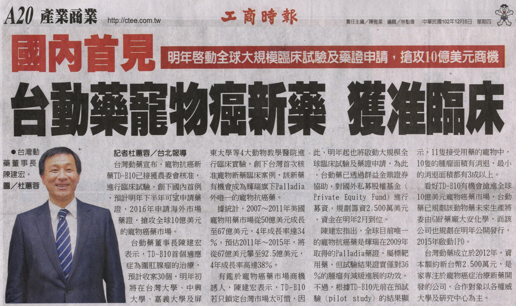 台動藥董事長陳建宏表示,TD-B10首個適應症為圍肛腺瘤的治療, 預計收案30個,明年初將在台灣大學、中興大學、嘉義大學及屏東大 學等4大動物教學醫院進行臨床實驗,創下台灣首次核准寵物新藥臨 床案例,該新藥有機會成為輝瑞旗下Palladia外唯一的寵物抗癌藥。