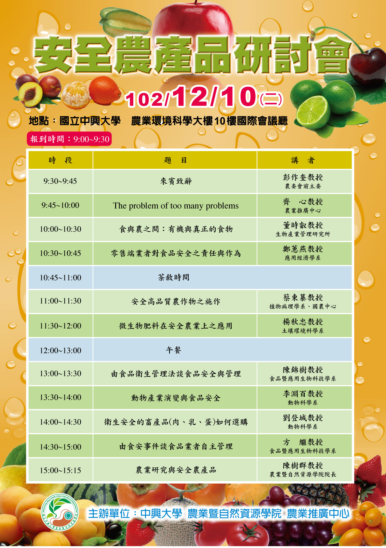 此次研討會的講者皆為一時之選,將由農委會前主委彭作奎開場,緊接著為10場15至30分鐘不等的專題講座,分上下午兩場,上午場主講人與講題分別為:興大農推中心主任/昆蟲系齊心教授「The problem of too many problems」、興大有機農夫市集創辦人董時叡教授「食與農之間:有機與真正的食物」、興大實習商店主任/應經系鄭蕙燕教授「零售端業者對食品安全之責任與作為」、興大國農中心主任/植病系蔡東纂教授「安全高品質農作物之施作」、土環系楊秋忠講座教授「微生物肥料在安全農業上之應用」。