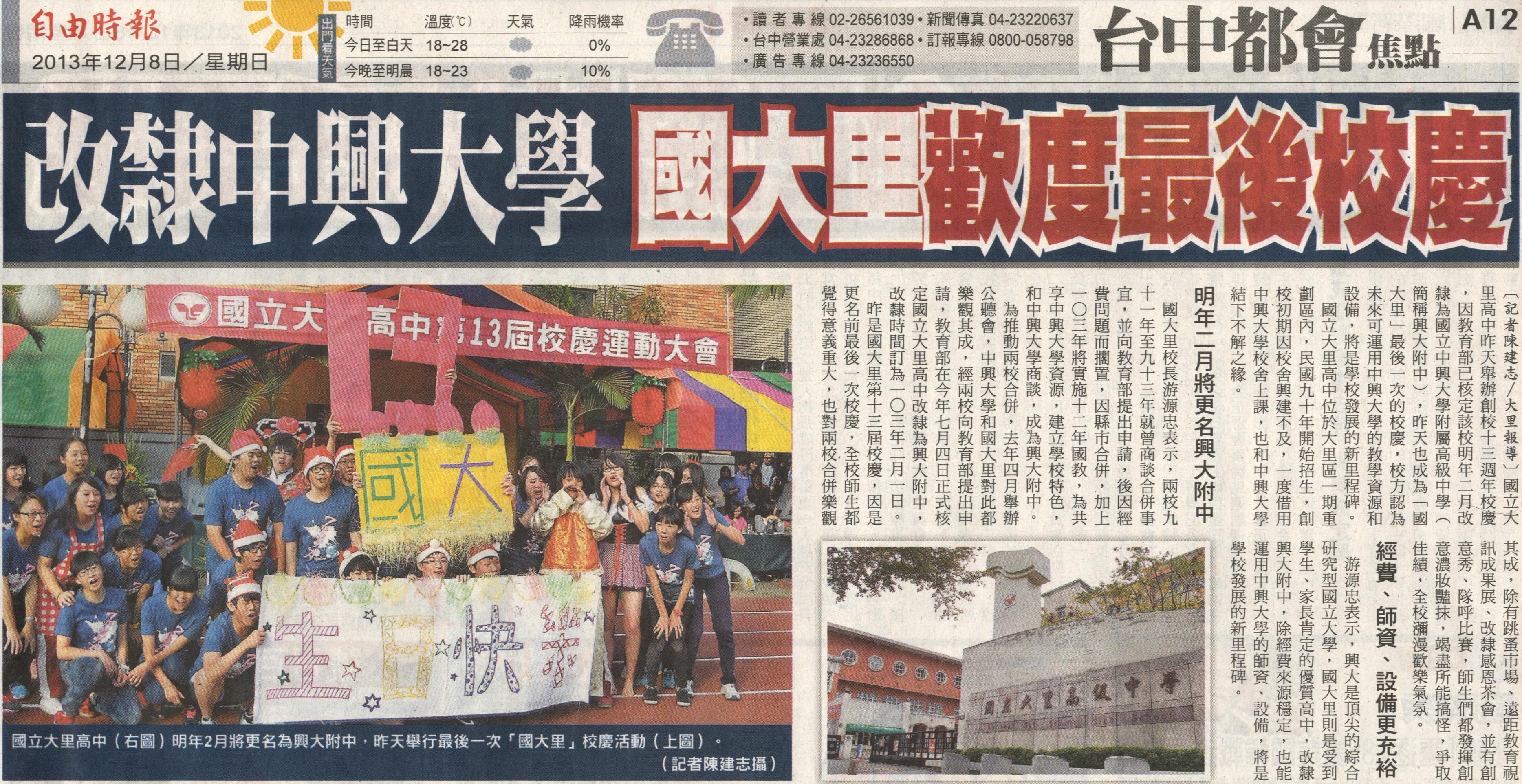 國立大里高中昨天舉辦創校十三週年校慶,因教育部已核定該校明年二月改隸為國立中興大學附屬高級中學(簡稱興大附中),昨天也成為「國大里」最後一次的校慶,校方認為未來可運用中興大學的教學資源和設備,將是學校發展的新里程碑。