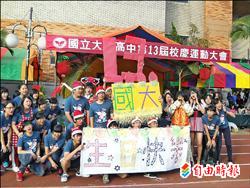 昨是國大里第十三屆校慶,因是更名前最後一次校慶,全校師生都覺得意義重大,也對兩校合併樂觀其成,除有跳蚤市場、遠距教育視訊成果展、改隸感恩茶會,並有創意秀、隊呼比賽,師生們都發揮創意濃妝豔抹,竭盡所能搞怪,爭取佳績,全校瀰漫歡樂氣氛。
