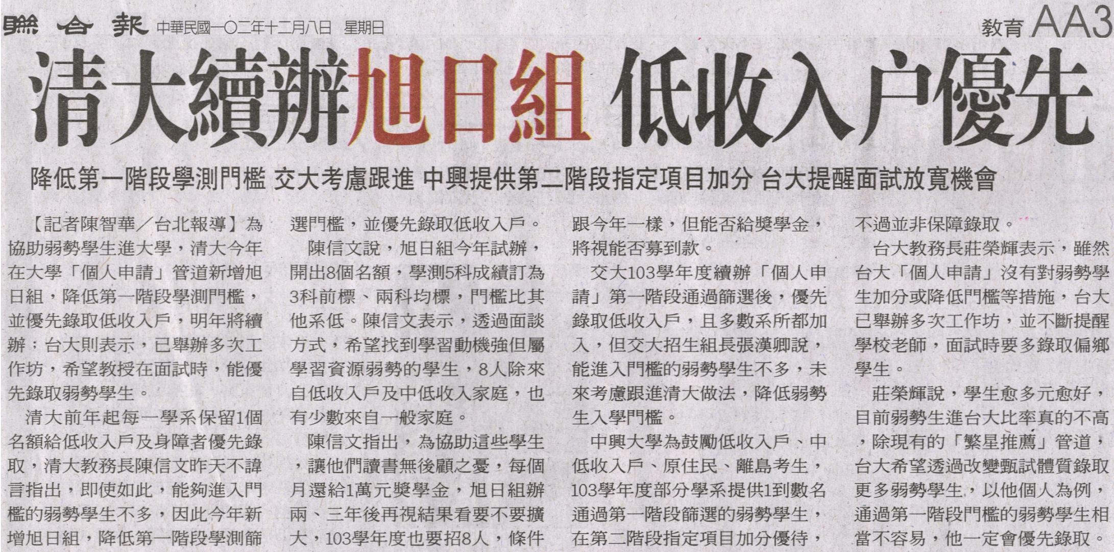 為協助弱勢學生進大學,清大今年在大學「個人申請」管道新增旭日組,降低第一階段學測門檻,並優先錄取低收入戶,明年將續辦;台大則表示,已舉辦多次工作坊,希望教授在面試時,能優先錄取弱勢學生。