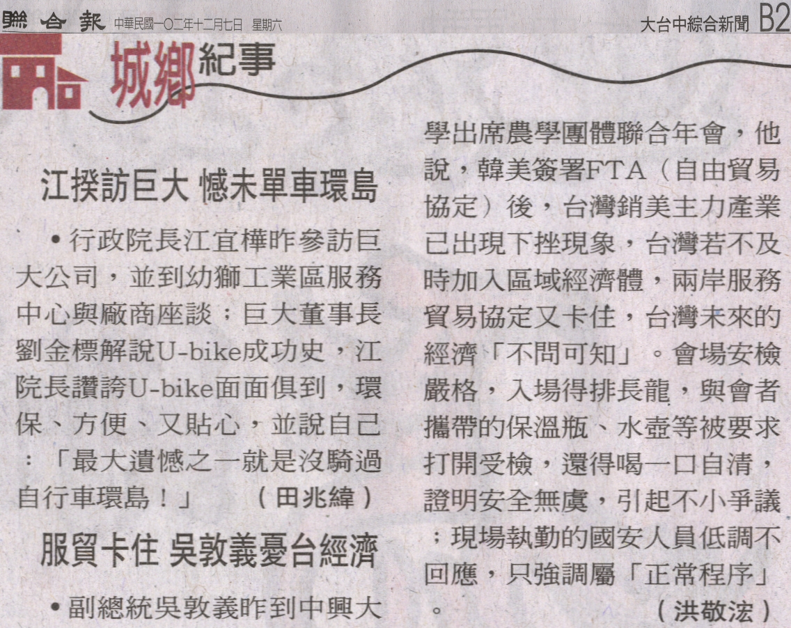 【媒體報導】服貿卡住 吳敦義憂台經濟