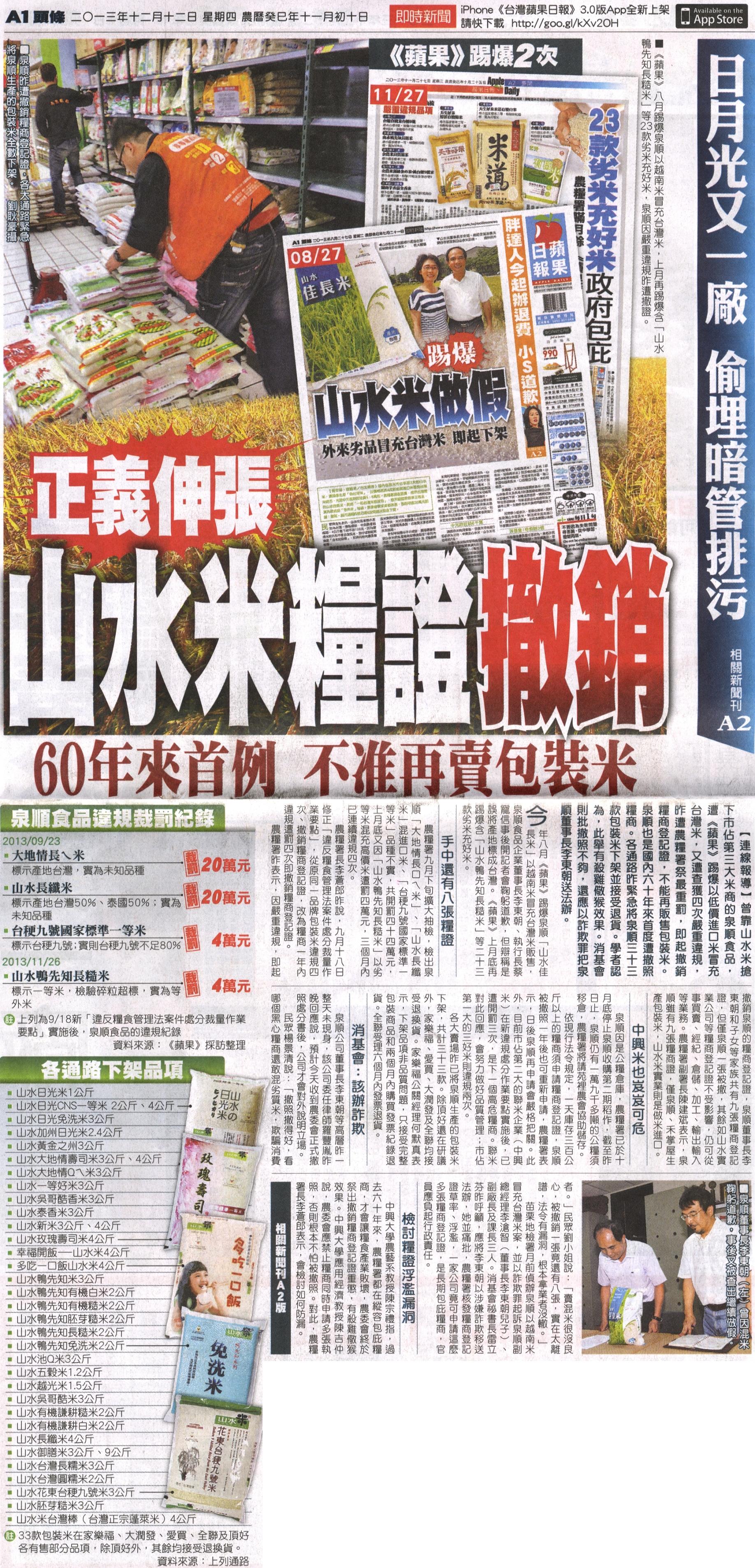 今年八月《蘋果》踢爆泉順「山水佳長米」以越南米冒充台灣米販售,泉順食品企業董事長李東朝、執行長蔡寵信事後開記者會鞠躬道歉,但辯稱是誤將產地標成台灣。《蘋果》上月底再踢爆含「山水鴨先知長糙米」等二十三款劣米充好米。