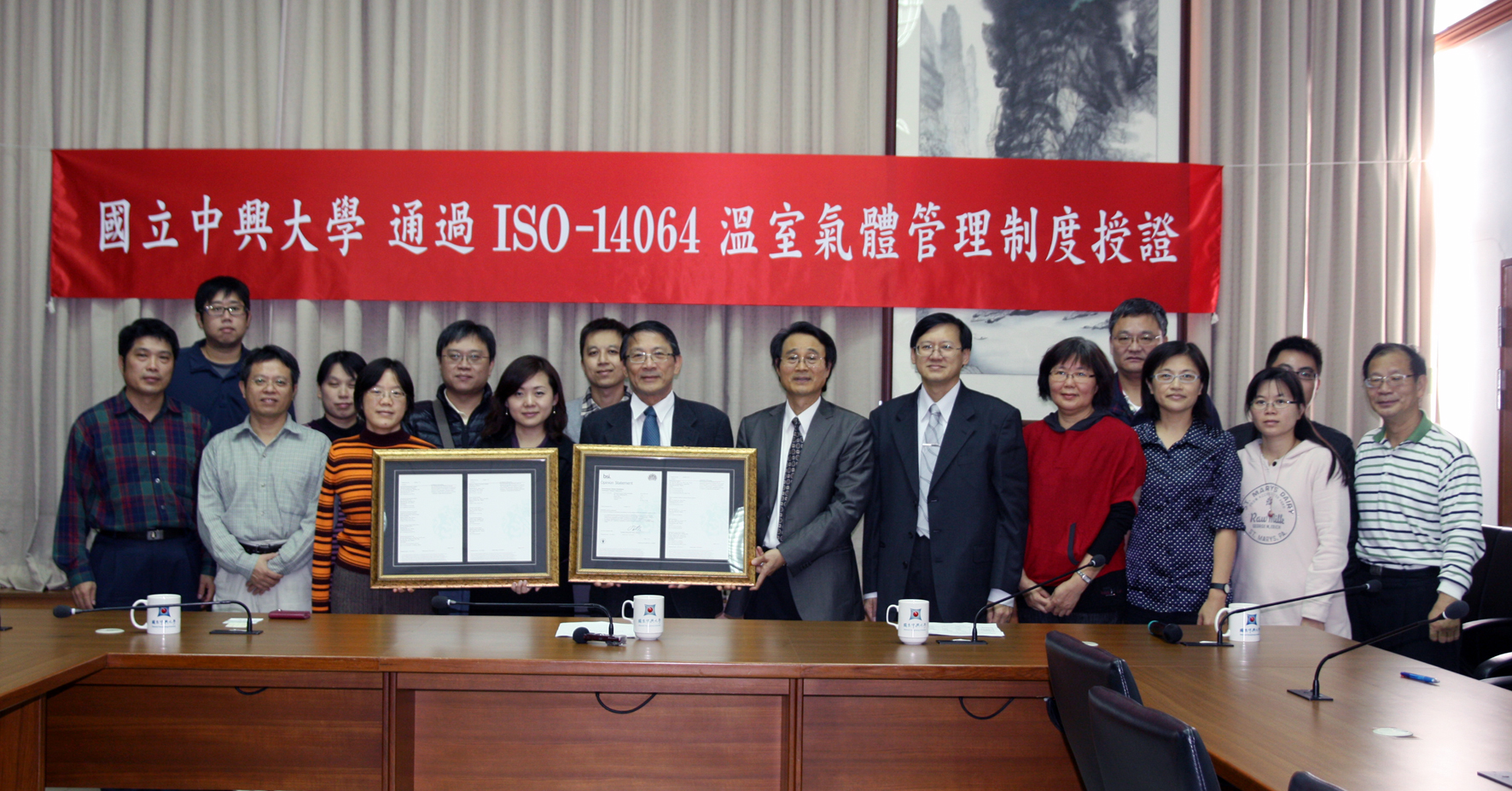 授證儀式由英國標準協會簡慧伶協理蒞校頒發證書,興大李德財校長受證。興大自101年12月起導入溫室氣體管理制度,針對校本部及惠蓀林場、新化林場等15處校地範圍進行溫室氣體盤查。盤查期間以100年為基準,計算出溫室氣體總排放量為3萬4639公噸CO2e (二氧化碳當量),其中,直接排放量為1976公噸CO2e,佔總排放量比例5.70%,涵括鍋爐與瓦斯筒等化石燃料衍生的氣體排放、公務車與農機用具等運輸工具的氣體排放等;能源間接溫室氣體排放量主要是從全校外購的電力度數換算得出,為3萬2662公噸CO2e,佔總排放量比例94.30%。興大也訂下每年減少溫室氣體1%,103年前達到節電5%的目標。