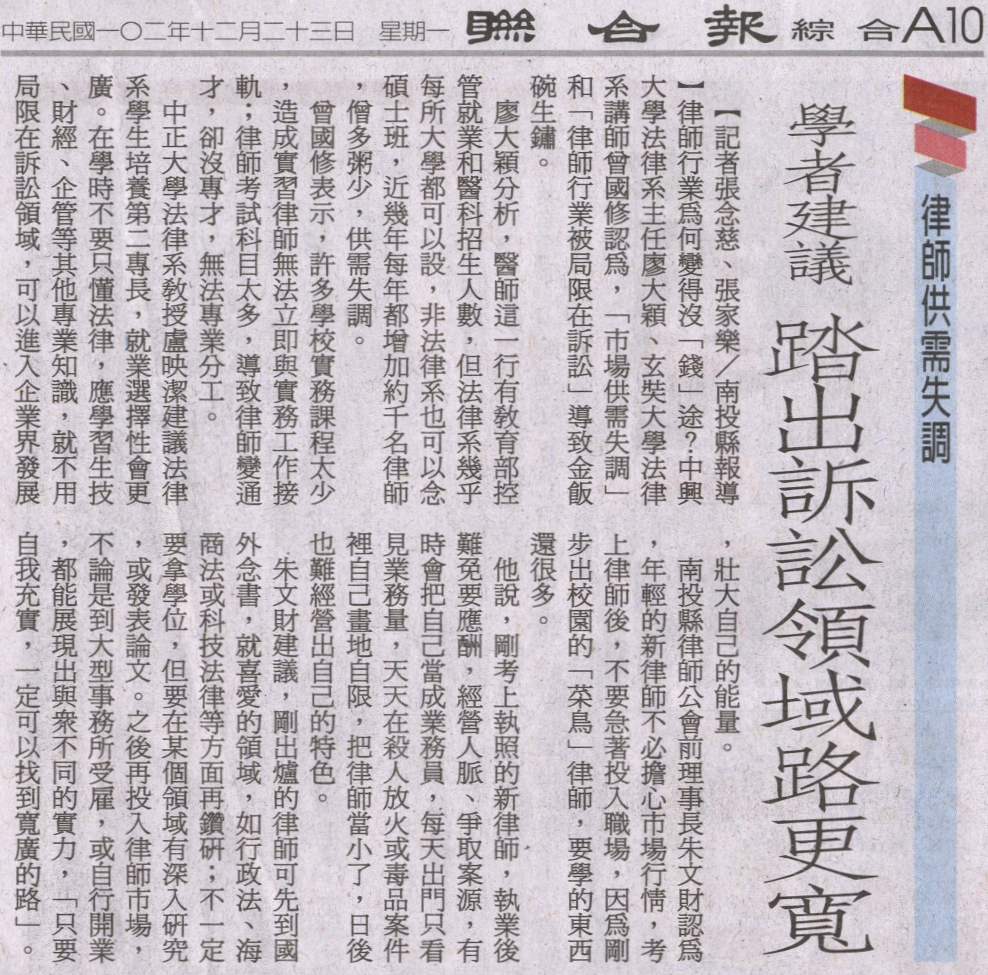 律師行業為何變得沒「錢」途?中興大學法律系主任廖大穎、玄奘大學法律系講師曾國修認為,「市場供需失調」和「律師行業被局限在訴訟」導致金飯碗生鏽。